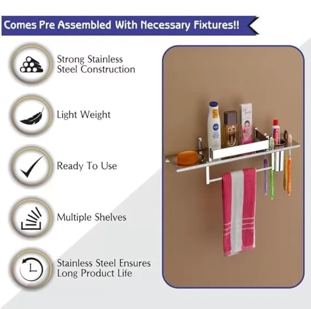 The BUMBERELL Wall-Mounted Multipurpose Bathroom/Kitchen Shelf/Rack is a highly versatile and durable storage solution designed to enhance both your bathroom and kitchen spaces. Here's a breakdown of its features and benefits: