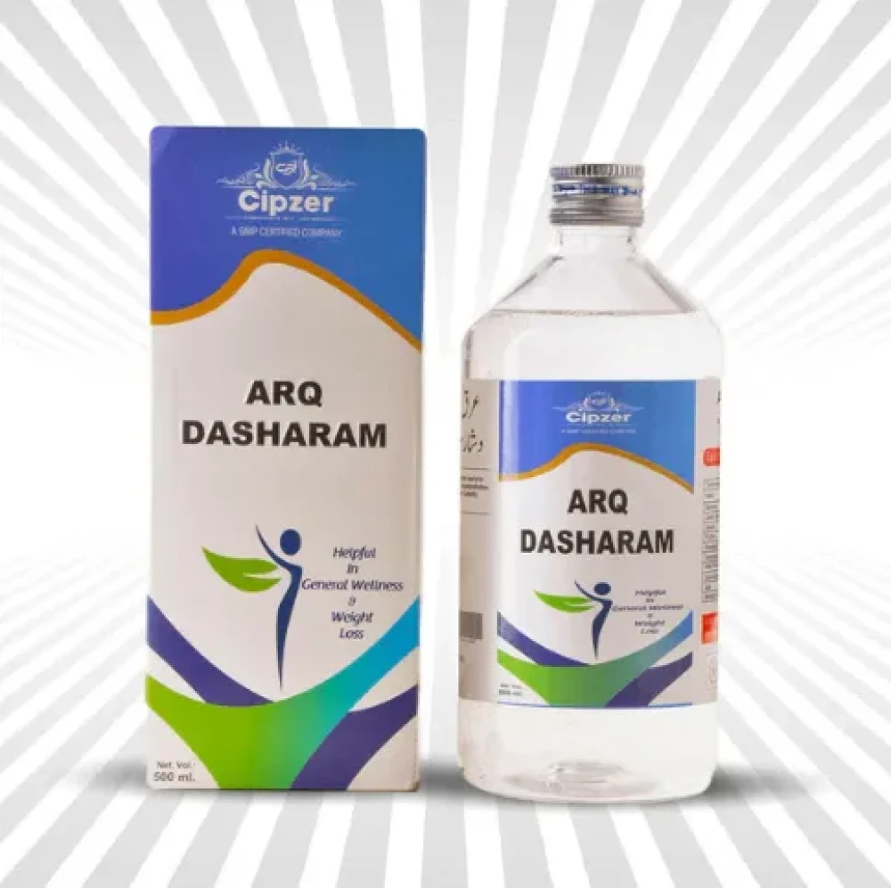 Cipzer Arq Dasharam is a proprietary Unani medicine made using a combination of herbs used in anti-inflammatory, analgesic, anti-bacterial, hepatoprotective, diuretic, anti-dysentric, appetiser, astringent, cathartic, cholagogues and demulcent.