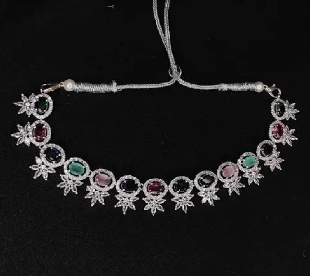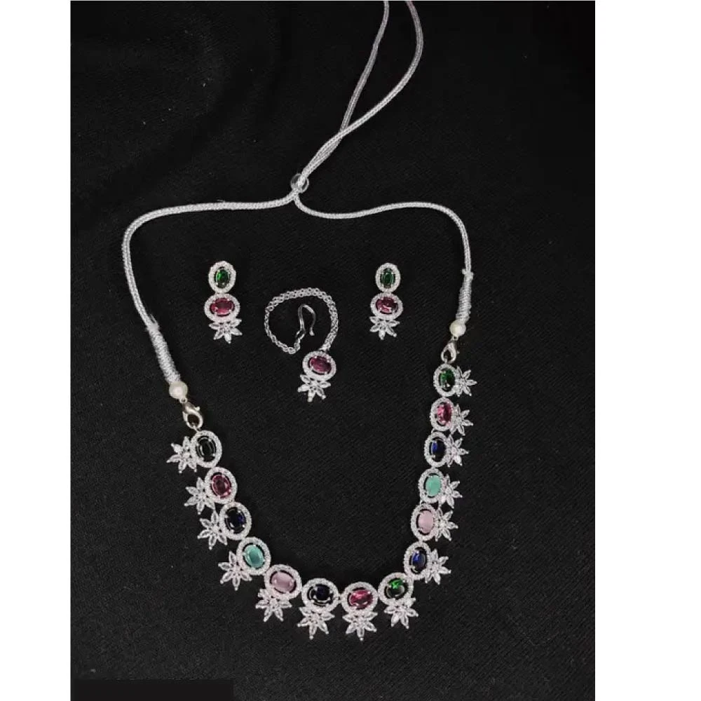 Each piece in this set is adorned with dazzling cubic zirconia stones, also known as American diamonds, meticulously crafted to resemble the brilliance of genuine diamonds. The flower-shaped design adds a delicate and feminine touch, making it perfect for both everyday wear and special occasions.