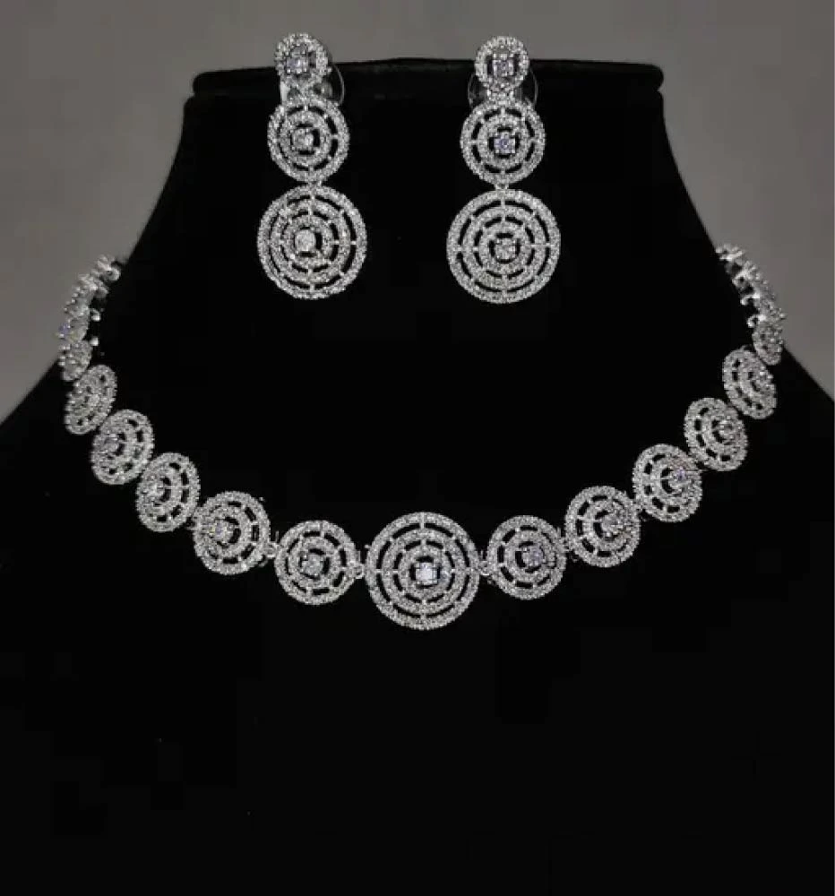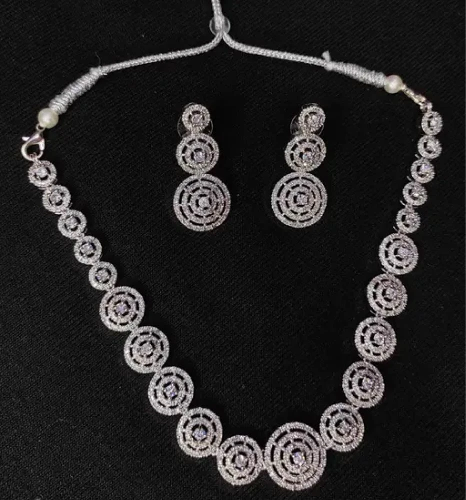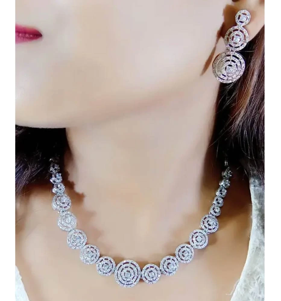 Each piece is adorned with brilliant white cubic zirconia stones, also known as American diamonds, meticulously crafted to emulate the sparkle and brilliance of genuine diamonds. The intricate design of the necklace and earrings showcases the stones' beauty, creating a stunning visual appeal that captivates attention.