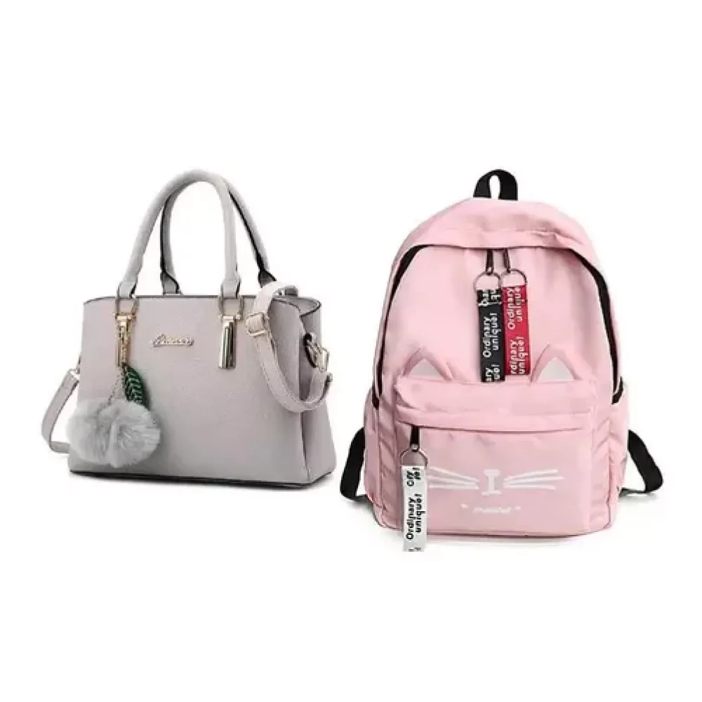 Fancy Grey Shopper Handbag and Pink Mew Backpack