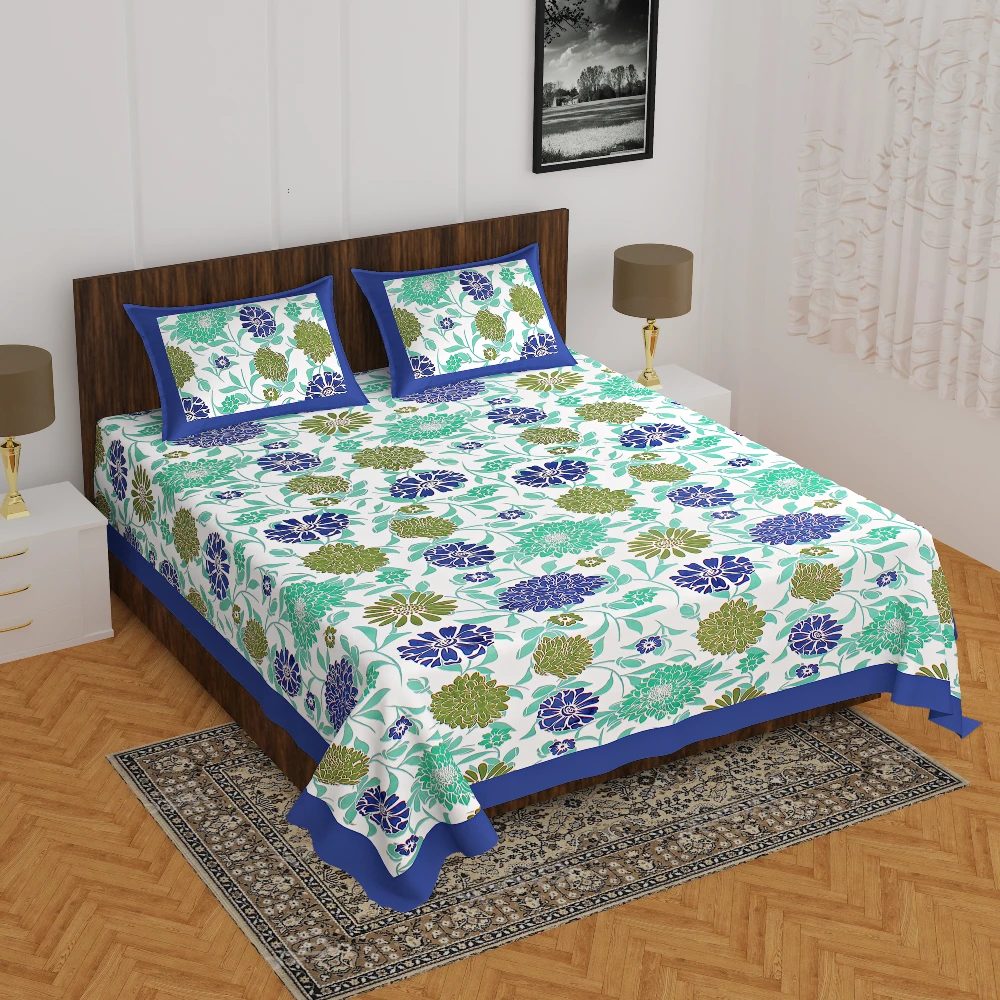 Jaipuri Sanganeri Floral Blue and Green Printed Double Bedsheet with 2 Pillow Cover
