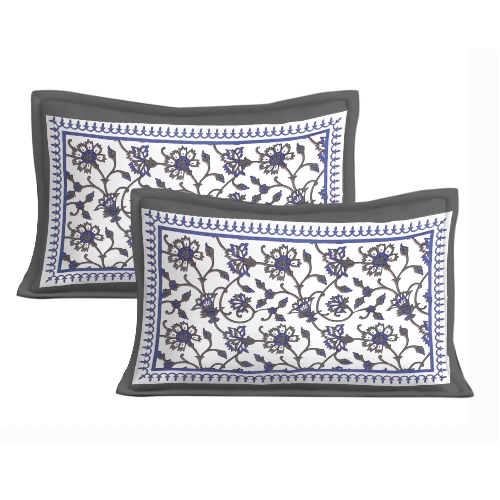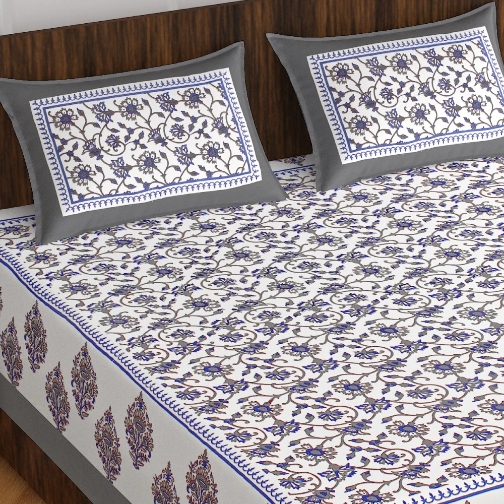 Jaipuri Sanganeri Floral Grey and White Printed Double Bedsheet with 2 Pillow Cover