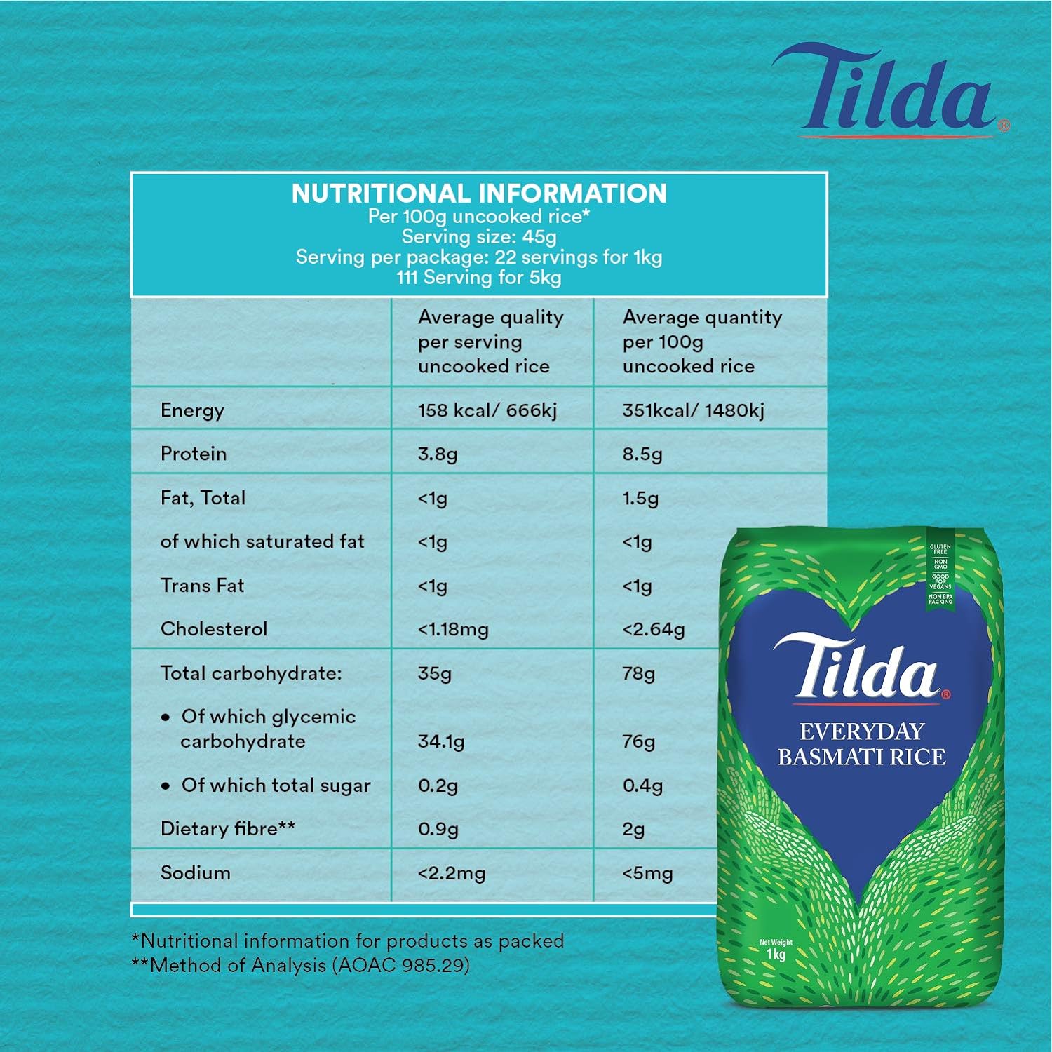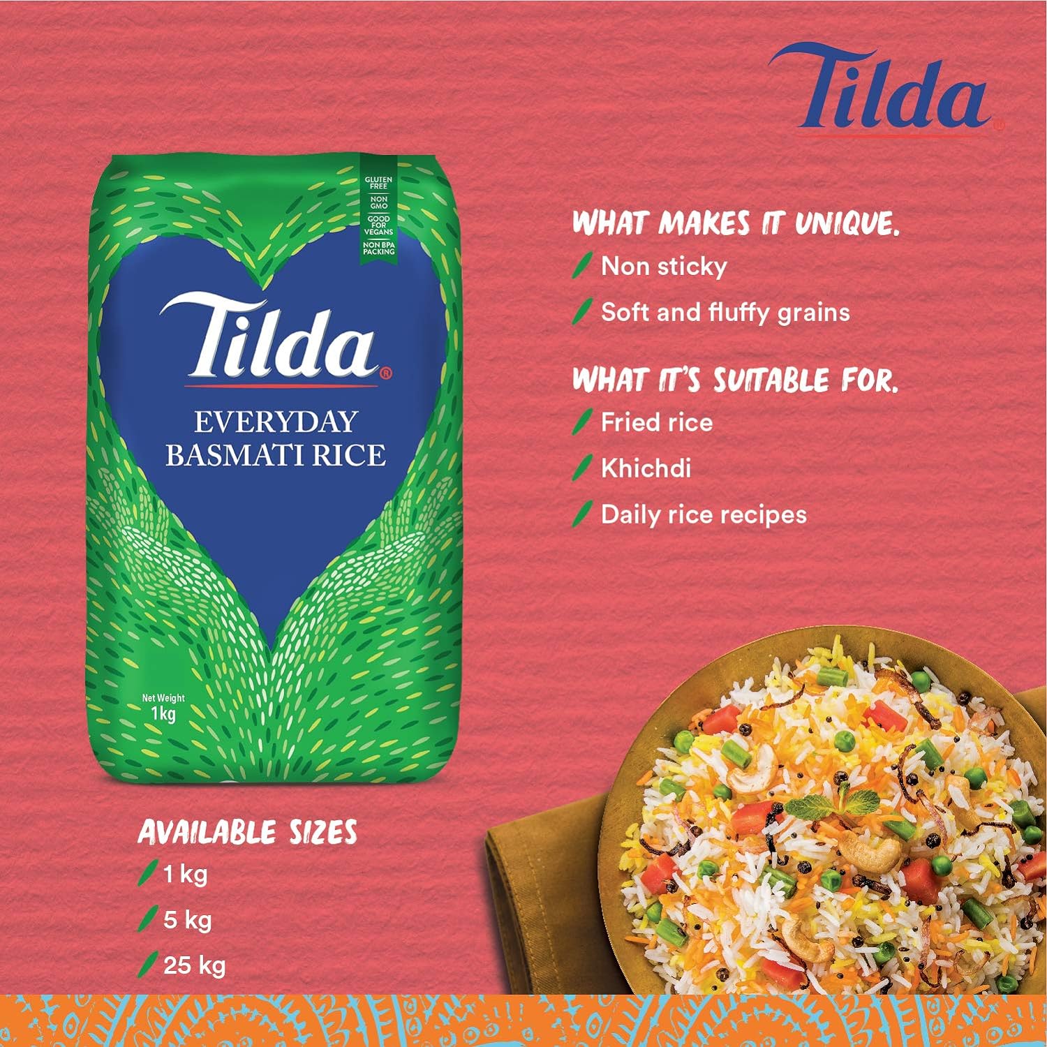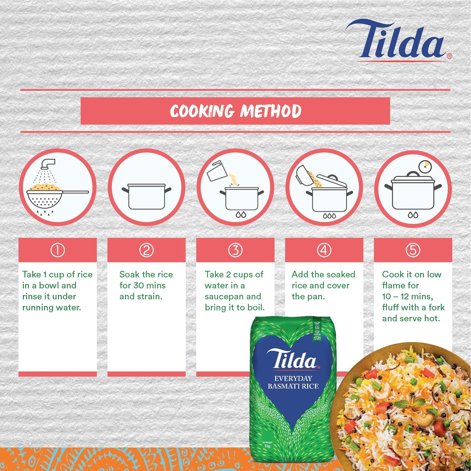 Tilda Everyday basmati rice is an elegant basmati rice experience that makes every meal a special one. All our packs are hygienically packed.We have unique and wide portfolio, there is rice for every Indian's favourite rice based dish. Iconic global brand with 50 years of heritage. Tilda Everyday Basmati Rice is defined by soft texture. These non sticky, gluten free grains good for vegans. It is ideal for serving with special dishes like rajma chawal, chettinad chicken curry, kadhi chawal, machhi bhaat, sambhar Rice, lemon rice, dal etc. Ideal for dishes prepared regularly in households like steamed rice, jeera rice, khichdi and fried rice, these special everyday basmati rice grains help you bring home the flavor of basmati at affordable price.