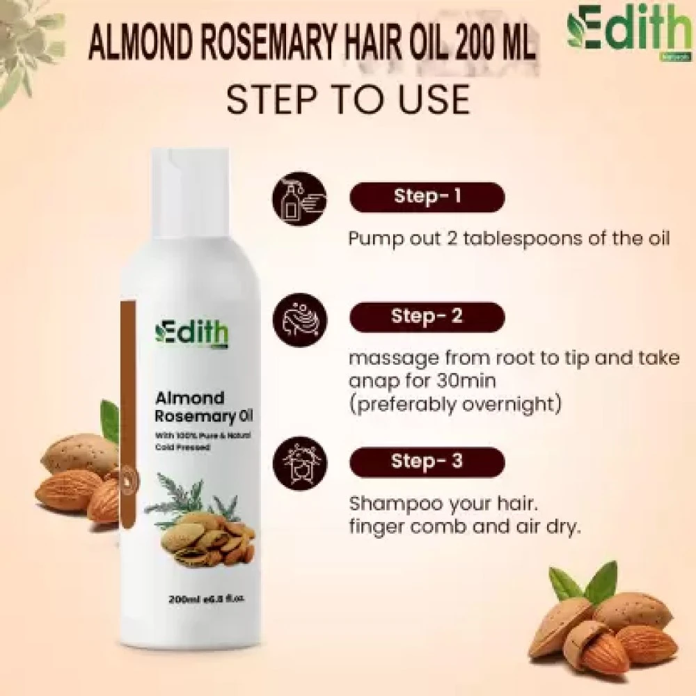 Brand: Edith Model Name: Almond Rosemary Oil for Hair Growth, Shiny Strong Hair Quantity: 200 ml Ideal for: Men & Women Applied for: Anti-hair Fall, Hair Growth, Hair Thickening, Nourishment, Lustre & Shine Organic: Yes Type: Almond Oil, Rosemary Essential Oil Free from Sulfates: Yes Suitable for Hair Types: All Hair Types Packaging: Bottle Maximum Shelf Life: 24 Months Composition: 100% Cold Pressed Almond Rosemary Oil Other Features: Promotes hair growth Net Quantity: 200 ml