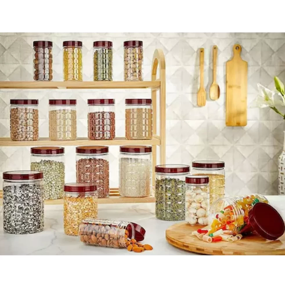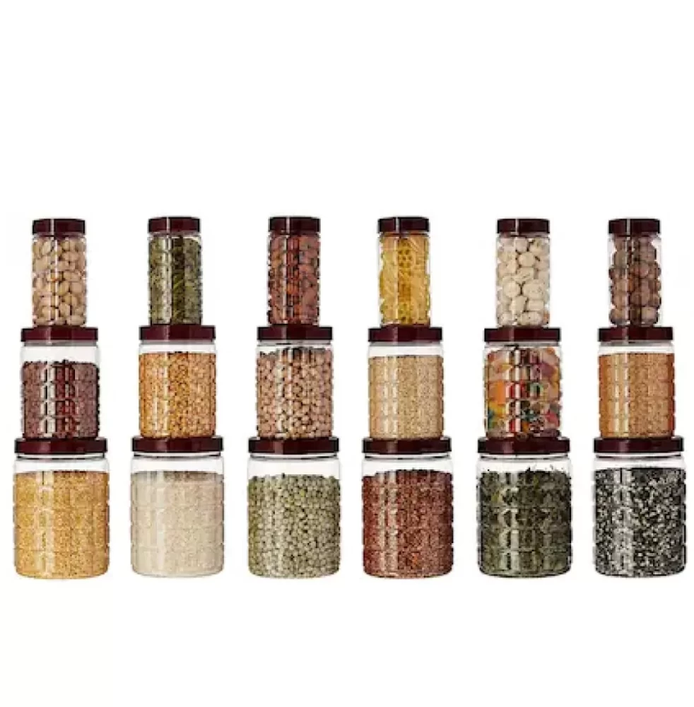 This stockpiling compartment set comprises of 18 pieces in shifting sizes of 1200 ml, 600 ml, and 300 ml, with 6 containers in each size. These can be utilized to store and arrange flavors like chills and mustard, or staples like rice and heartbeats just as dry natural products, oats and bread rolls.