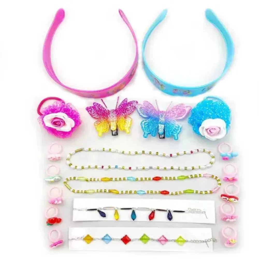 The set comes in a durable plastic box. The set comprises of 10 pcs of cartoon designed or floral designs or different shapes like fruits, insects which are popular among the kids, 2 pcs of bracelets, 2 pcs of necklaces, 2 printed thick hair bands, 2 butterflies and 2 flower rubber bands. All things are the most popular and favorites of the kids. Kids demand such things like rings in day to day routine to play along. The set is a mix of soothing pastel and bright colors to make it a favorite and the only choice of kids to own for them.