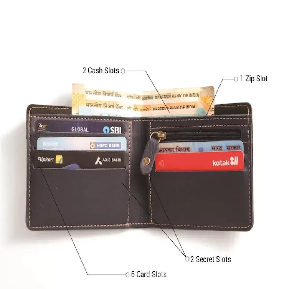 • FUNCTIONAL DESIGN: This stylish mens wallet offers plenty of space to store your valuables. It features 2 cash compartments, 5  card slots, 2 secret pocket and 1 Zip Slot, all within a slim wallet size of 12 X 8.6 X 1.5 cm.