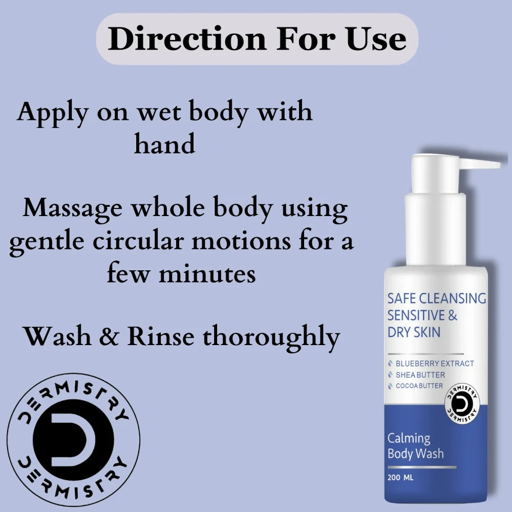 Dermistry Calming Body Wash Soothe as you cleanse with this gentle, soap-free shower gel specially formulated to respect your skin's natural moisture barrier and pH. This gentle formula won't strip your skin of moisture. Enriched with Shea Butter, Cocoa Butter and blue Berry Ext is specially formulated for sensitive, dry skin.