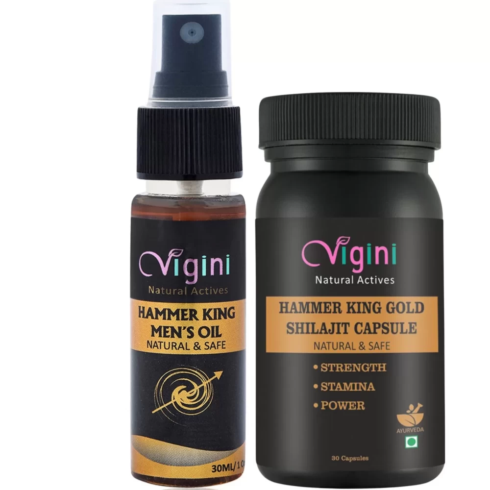 Vigini Hammer King Gold Shilajit Capsules Powerful Natural Ayurvedic Herbal Ingredients in full concentration. Effective Safe Strength & Arousal Aphrodisiac Stamina Extreme Testosterone Booster Aphrodisiac Libido Enhancer Capsules. Powerful Ayurvedic Actives pure Shilajeet, Safed Musli, Abhrak Bhasma, Tribulus Terrestries, Trivang Bhasma. Abhrak Bhasma improves Libido and Reproductive health in Men. Hammer King Gold Pure Shilajit Capsules Natural Actives work to balance hormones that control desire, performance, and pleasure.