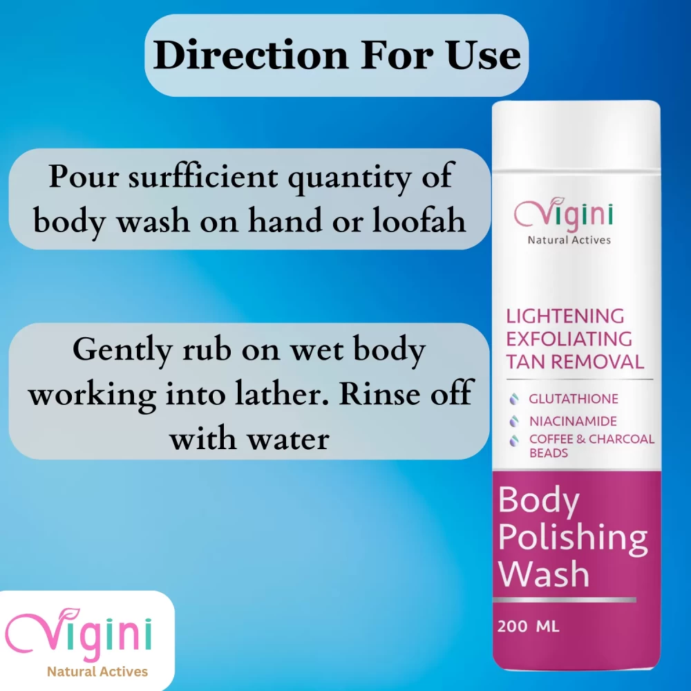 Vigini Lightening Brightening Body Polishing Wash it works to brighten skin tone all over your body with minimal effort without use of a scrub or bleach. Vigini Lightening Brightening Polishing Wash helps do away with pigmentation issues, marks, spots and gets you a clearer complexion to be precise. Easy to carry and easy to use pack is very handy and can be used anywhere.