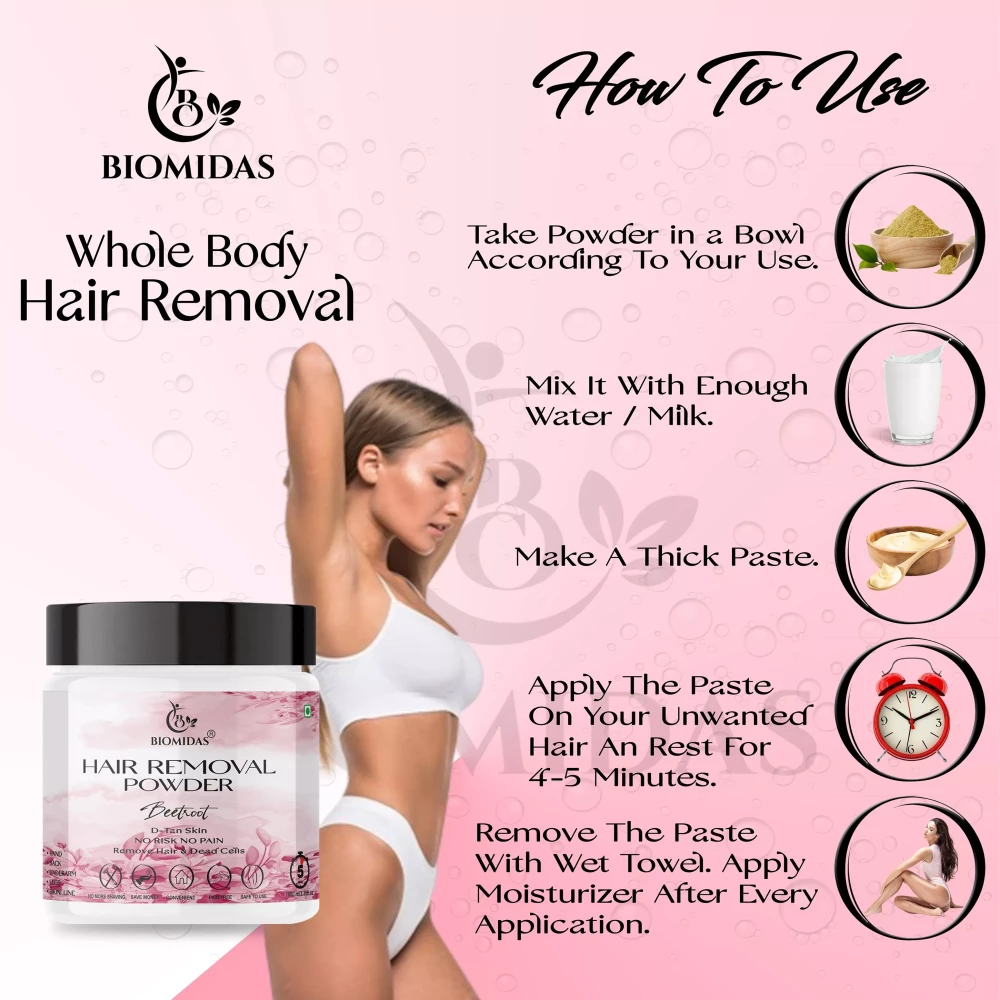 Biomidas Hair Removal Powder Is a Permanent Solution for Removing Unwanted Hair From your Body. This Powder Helps in Removing Hair Without any Pain. This powder helps in removing Hair Gently. Take this powder in a bowl according to your usage and then add a few Milk/water drops and make a thick paste of it and apply on that part of your body from where you want to remove your hair. Wait for 2-3 minutes and let it dry. Then clean it with water and apply moisturising cream on that part.
