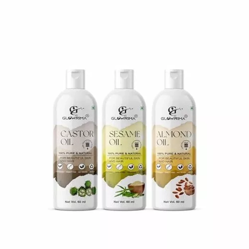 Glowrima 100% Pure Castor Oil and Sesame Oil and Almond Oil 60ML Combo Pack Of 3