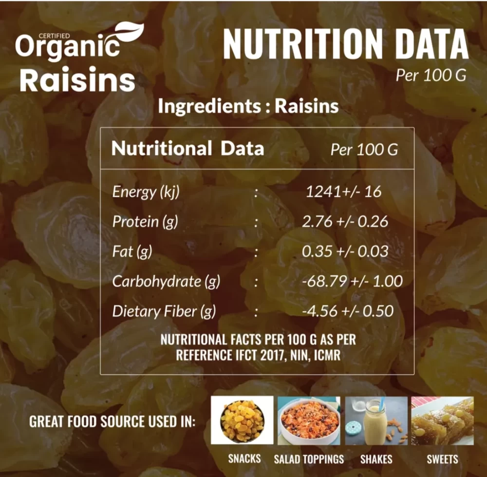 Raisins, often referred to as Kishmish,available in golden, black-ish, and green hues, are nutritional powerhouses are packed with fiber, iron, calcium, potassium, and various essential nutrients :
