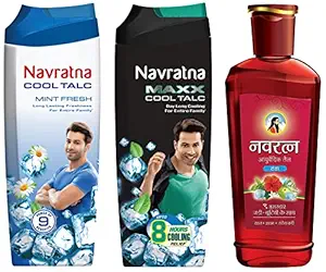 Navratna Gold Ayurvedic Cool Hair Oil - Mild Fragrance, Non-Sticky, For Rejuvenating & Relaxing 500 ml Navratna Gold is a marvel of Ayurveda. This non-sticky hair oil is a blend of premium herbs and exotic flowers. Its blissful massage brings alive the cooling of mountains and the smell of exotic flowers to refresh and rejuvenate you. Whenever you need relief from headaches and stress, try this enriching experience. Navratna Maxx Cool Talc 400 g New Navratna Maxx Cool Talc keeps you cool for longest time compared to ordinary talc. Longest Lasting Cooling Talc Only talcum powder in India with sweat-activated cooling technology. Its unique cooling action releases cooling when you sweat. Now Stay Cool and fresh even after you sweat.