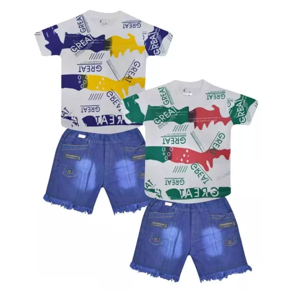 Design Features: The top showcases a playful printed pattern, adding a fun and vibrant touch to his outfit. The short sleeves and classic crew neckline provide a timeless look that pairs perfectly with the denim shorts for a coordinated and stylish ensemble.
