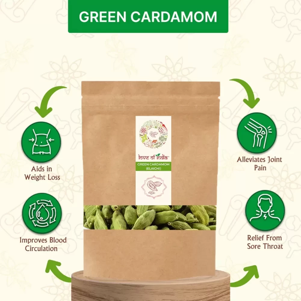Love of India's Green Cardamom (Elaichi), known as the Queen of Spices, has a delicate sweetness & a beautiful aroma when added to food.