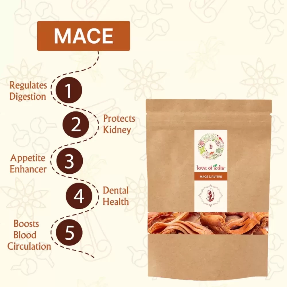 Mace spice can keep your digestive system healthy, encourage appetite, boost blood circulation, and even help relieve stress. Additionally, mace spice can treat cold and cough symptoms, and reduce inflammation and perfect for aroma and fragrance in Indian dishes.