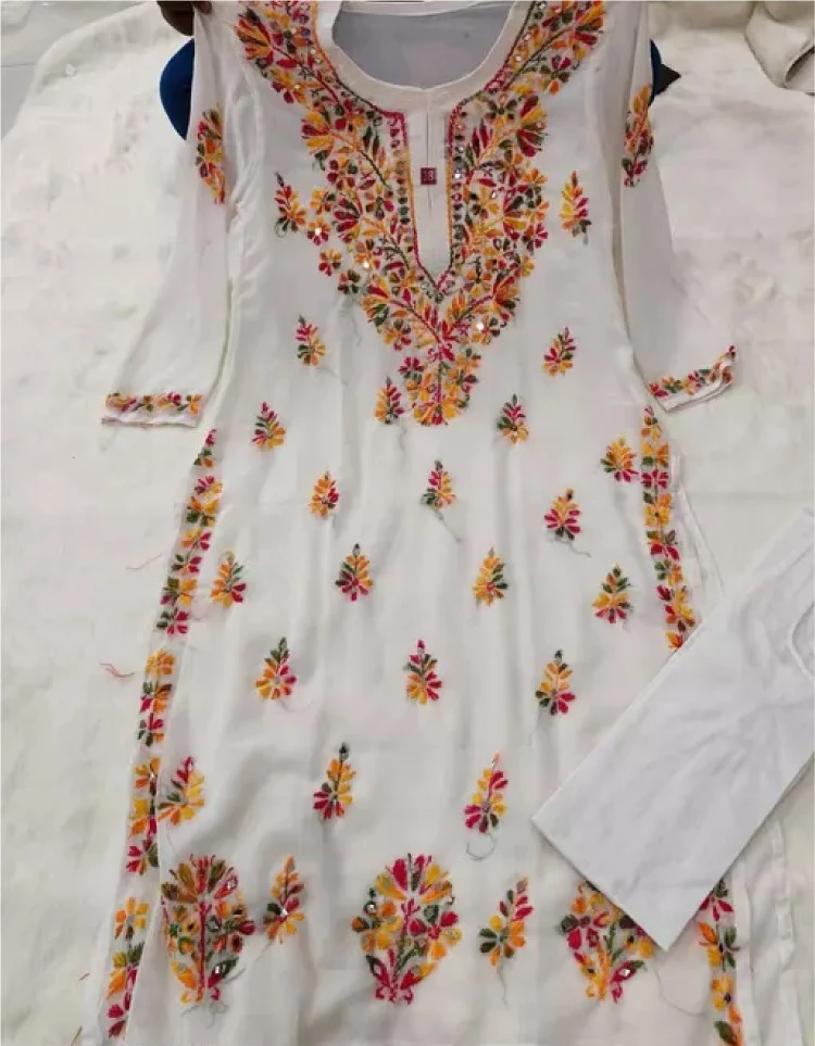 Adorned with intricate multicolour thread chikankari work, this kurti showcases exquisite craftsmanship and attention to detail. The intricate embroidery adds a touch of sophistication and charm, making it perfect for both casual and formal occasions.