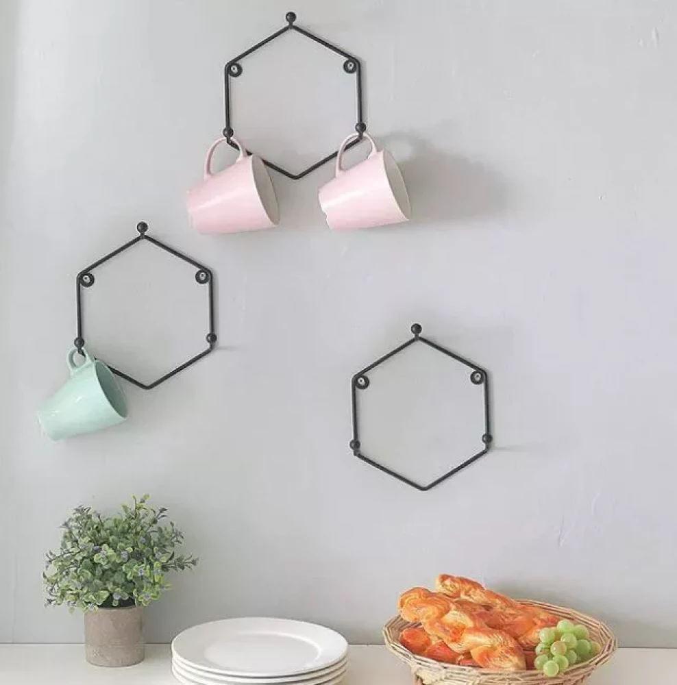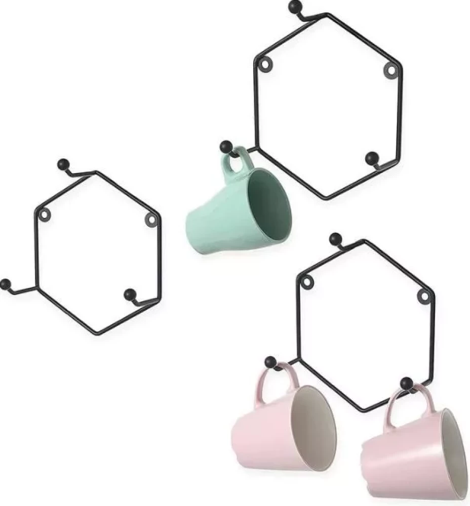 • It features a set of 3 hexagonal shelves, each with 3 hooks to hold cups, mugs, or teacups.