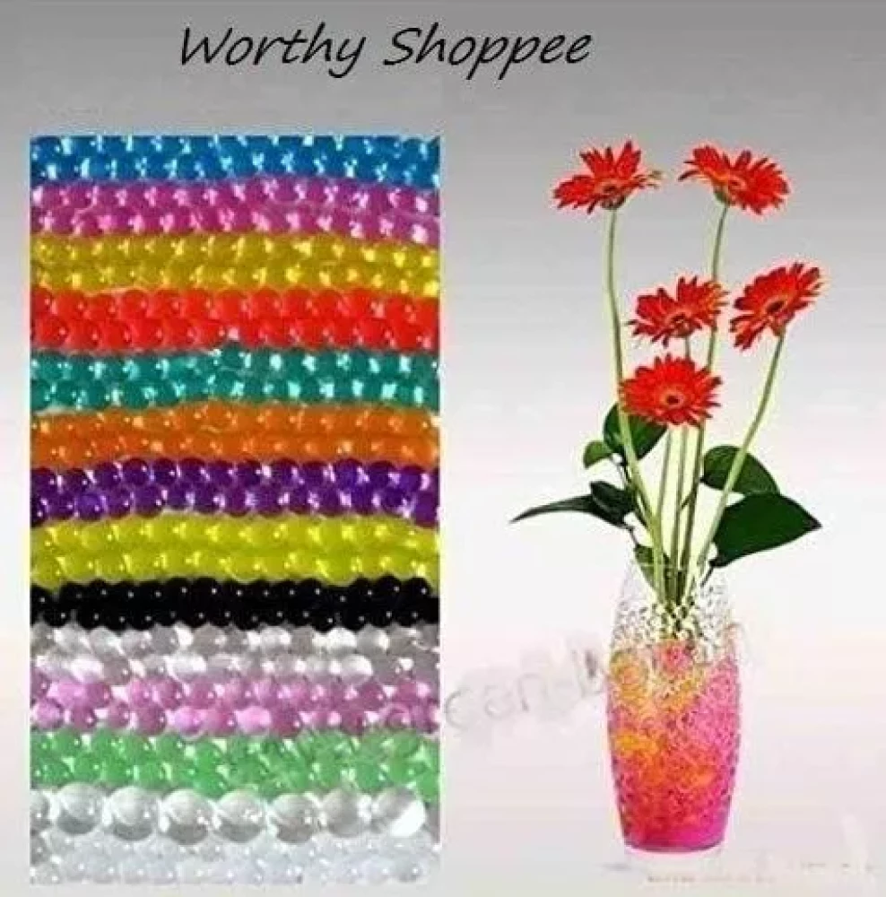 Our decorative beads are a colorful, crystal polymer water substitute for plants and flowers. The beads absorb over 100 times their weight in water to form glass-like pearls that slowly release water back into their environment. The brilliance of the beads makes them ideal for flower, plant and candle arrangements. Great around the home or office