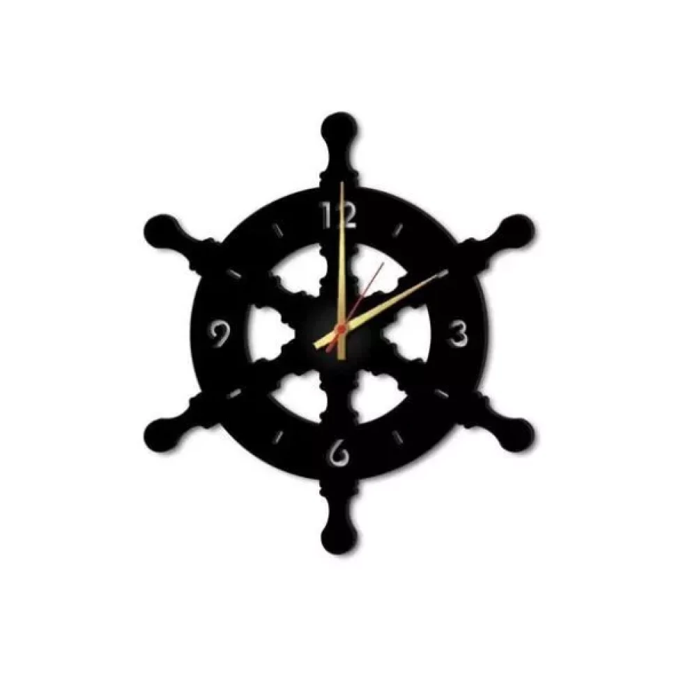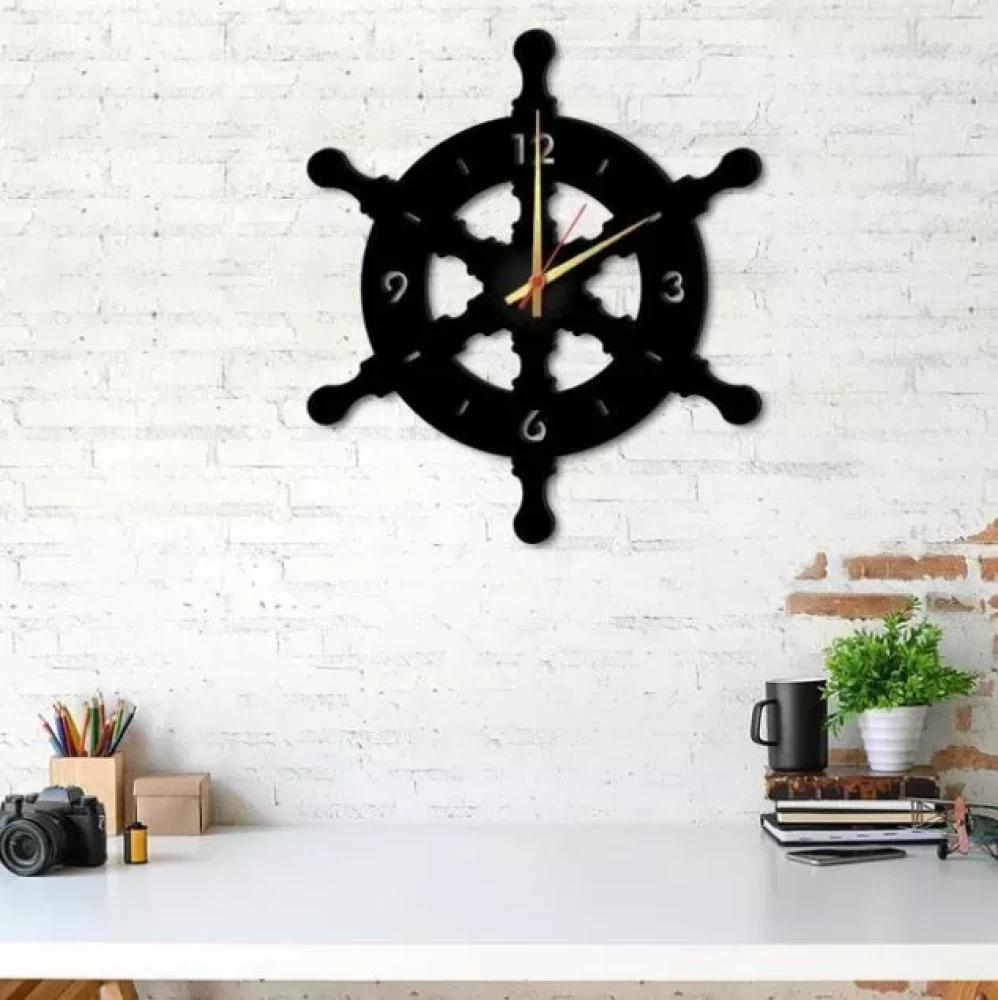 The impressive Designer  and stunning Black Ship Wheel Shape Wooden Wall Clock is made of a laser cut 7mm thick piece of MDF wood, professionally painted with high quality paint, protected with a layer of transparent matte finish varnish.