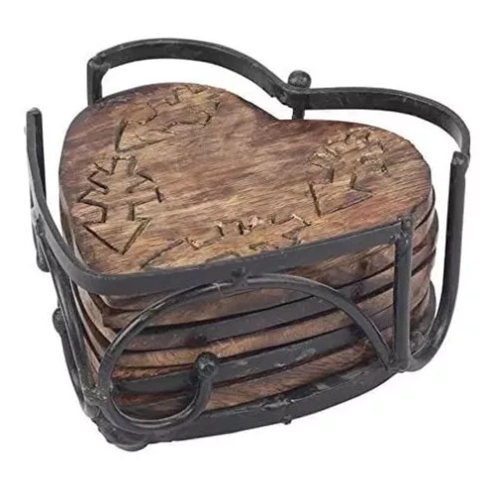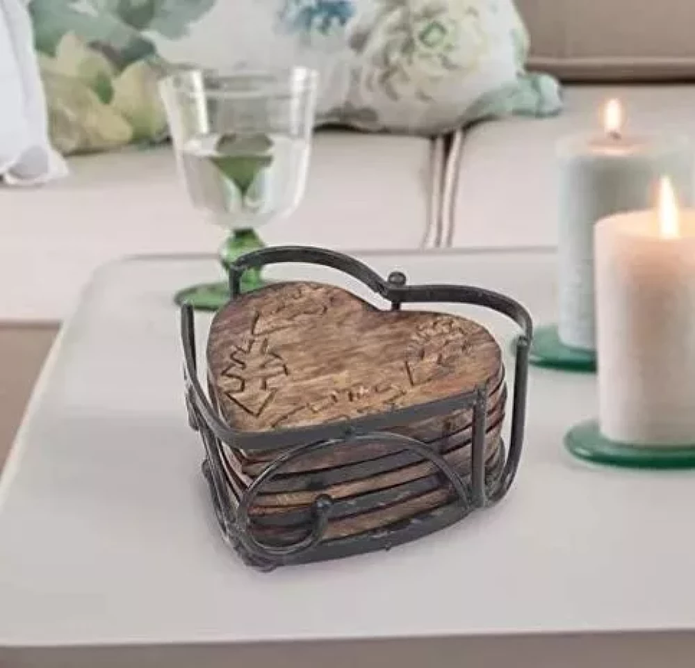 •  Handmade Wood and Iron Drink Coasters Sets with Holder Set of 6 in a Heart Shaped Holder with Heart Design