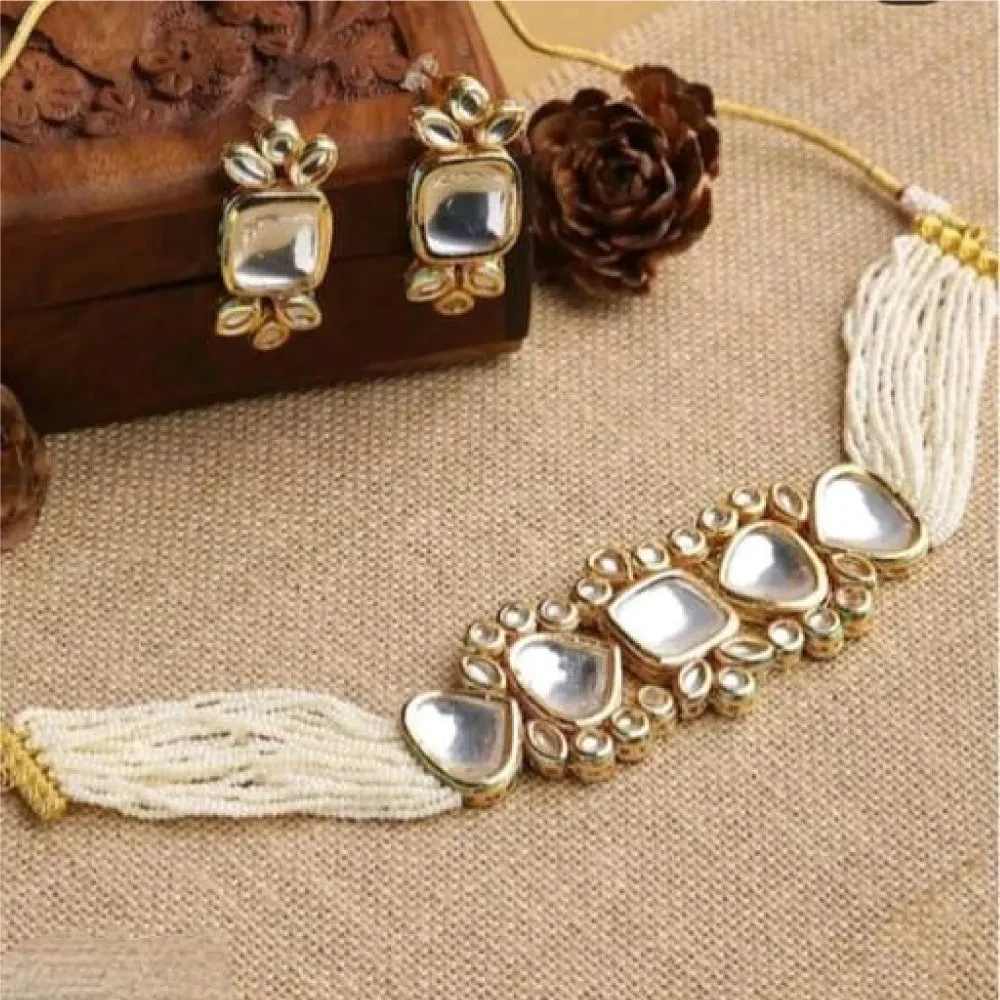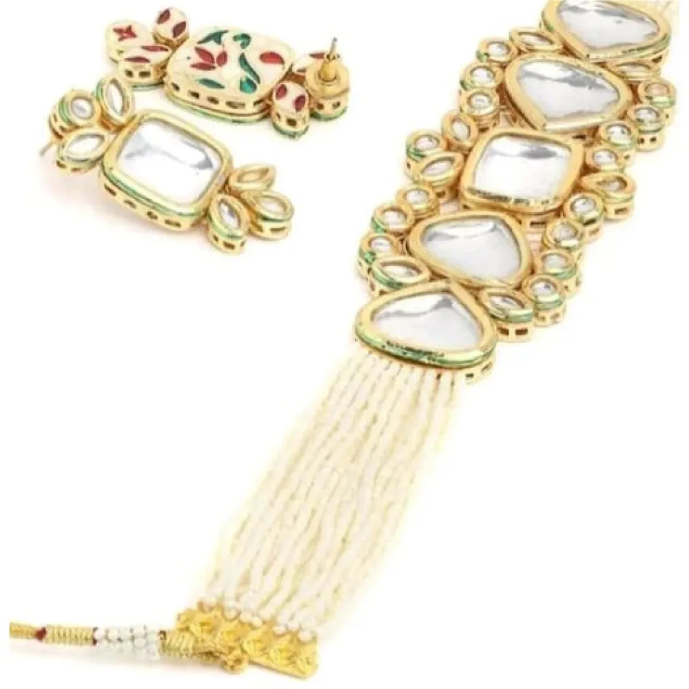 Elevate your traditional style with this exquisite Brass Kundan Moti Necklace, meticulously crafted to add a touch of luxury to your attire. This elegant set includes a choker and matching earrings, designed to enhance your look with a blend of classic charm and contemporary elegance.