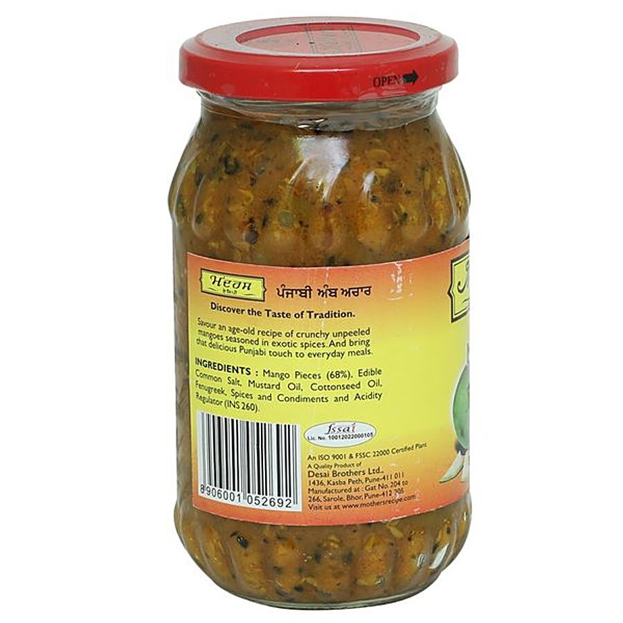 Mother's Recipe Pickle - Punjabi Mango is prepared in Punjabi style. It is made using high-quality mangoes and additional ingredients, resulting in a spicy taste. The mangoes are dried under the sun, mixed with seasoning, and transformed into this delightful Punjabi delicacy.