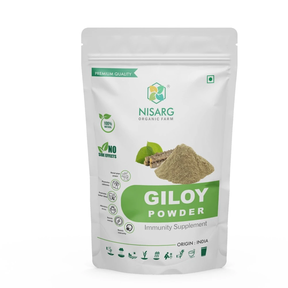 "Nisarg Organic Farm’s Neem Giloy Powder is a natural and organic remedy that removes toxins from the body, purifies the blood and fights bacteria. It is especially beneficial for people with liver disease and its antipyretic properties make it an effective remedy for reducing fever and easing the symptoms of life-threatening conditions like dengue, flu and malaria. Not only does it help to improve overall health, but it also gives you more energy and vitality, making it an ideal supplement for those seeking a healthier, happier life. Enjoy the natural benefits of this amazing powder and take your health to the next level!