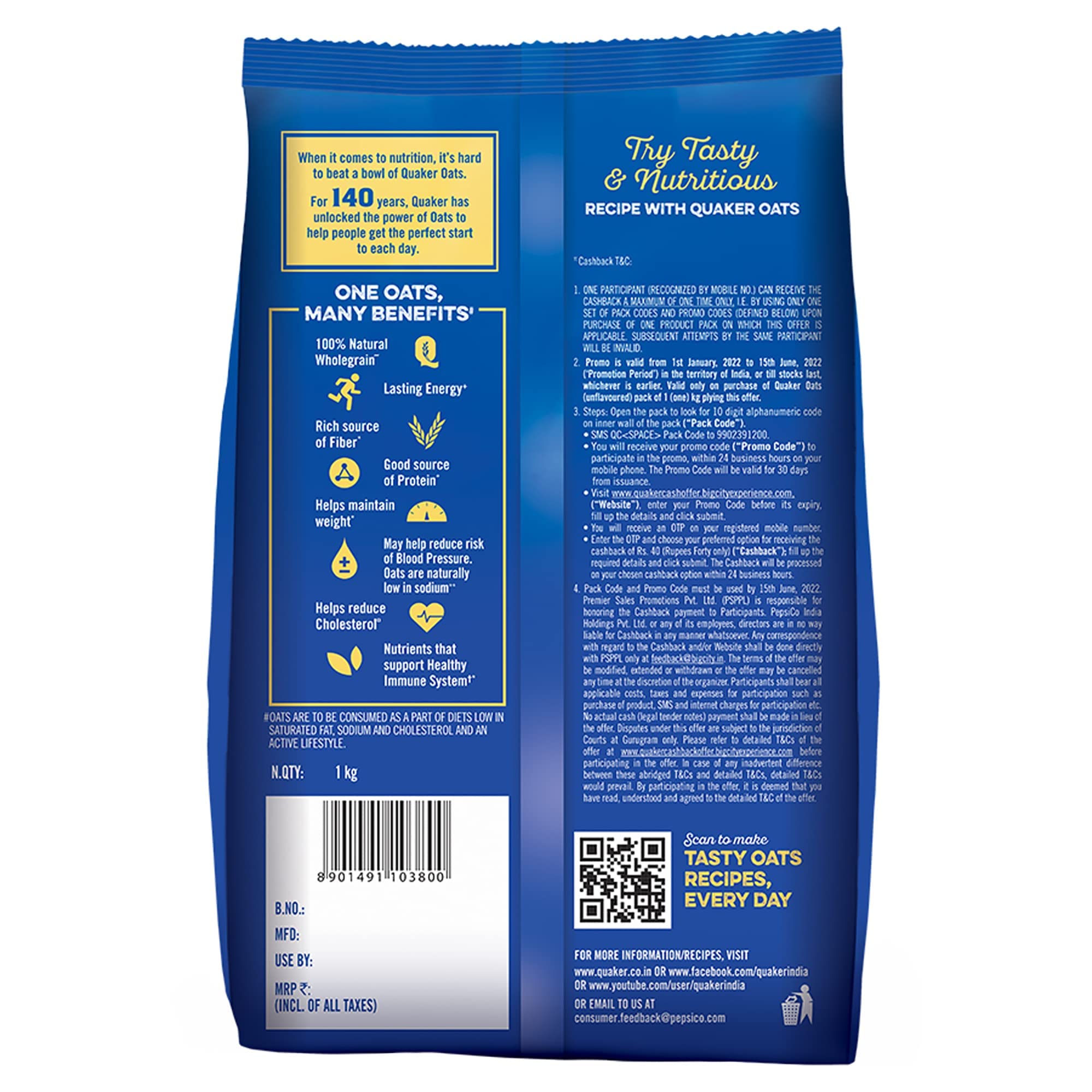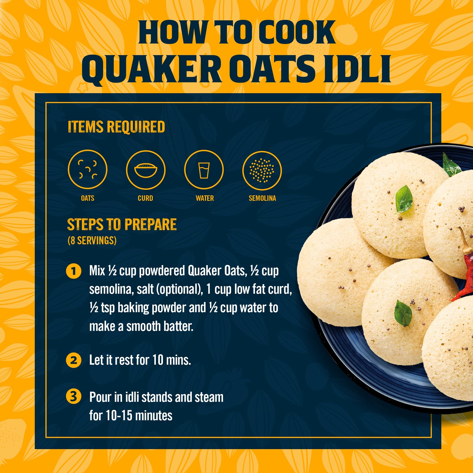 Make your mornings nutritious and tasty with Quaker natural whole grain oatsStart the day right with a bowl of nutritious Quaker Oats These 100 Natural Wholegrain Oats have complex carbohydrates that break down slowly, providing lasting energy. Along with an active lifestyle consuming 2 bowls of oats per day provides 3g of soluble fiber and Beta-glucan this helps reduce cholesterol as part of a diet low in saturated fat and sodium. They are also a rich source of fiber and protein. Quaker Oats can either be eaten sweet or savory. Enjoy the wholesome benefits of this whole grain in various meals or snacks at any time of the day. For a hearty breakfast meal, add milk topped with fruits and nuts for a warming sweet flavor, add honey, cinnamon, or brown sugar. You can also add them as a wholesome ingredient in your favorite dishes, such as Idli, Poha, Masala Oats, or Classic Oatmeal cookies.Key benefits 100 Natural Wholegrain Helps Reduce Cholesterol 2X Protein Fibre Lasting Energy Helps Maintain Weight Whole grain council. Oats contain fiber slowly absorbed carbohydrates that can increase satiety providing lasting energy. 3g or more per day of soluble fiber from oats helps reduce blood total- and LDL- cholesterol levels Comparison with similar food Breakfast cereal cornflakes. Atlas of Indian Food, 2015