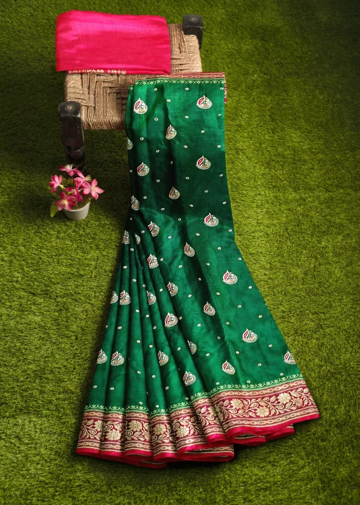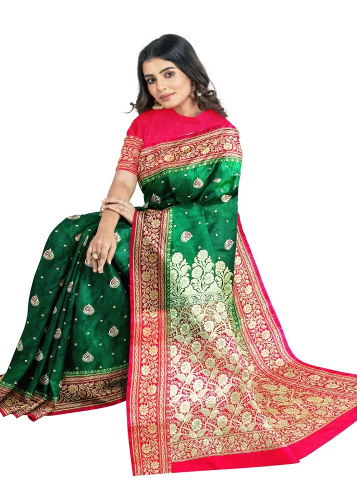 Exclusive Green Banarsi Satin Silk Embroidery Saree With Red Blouse