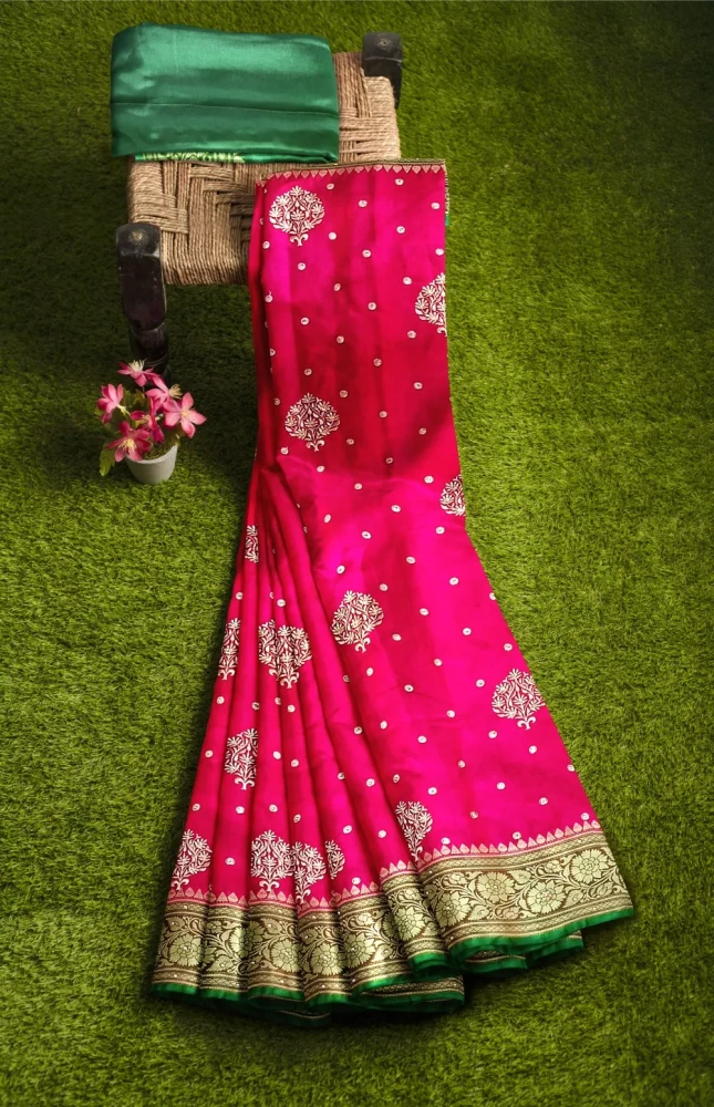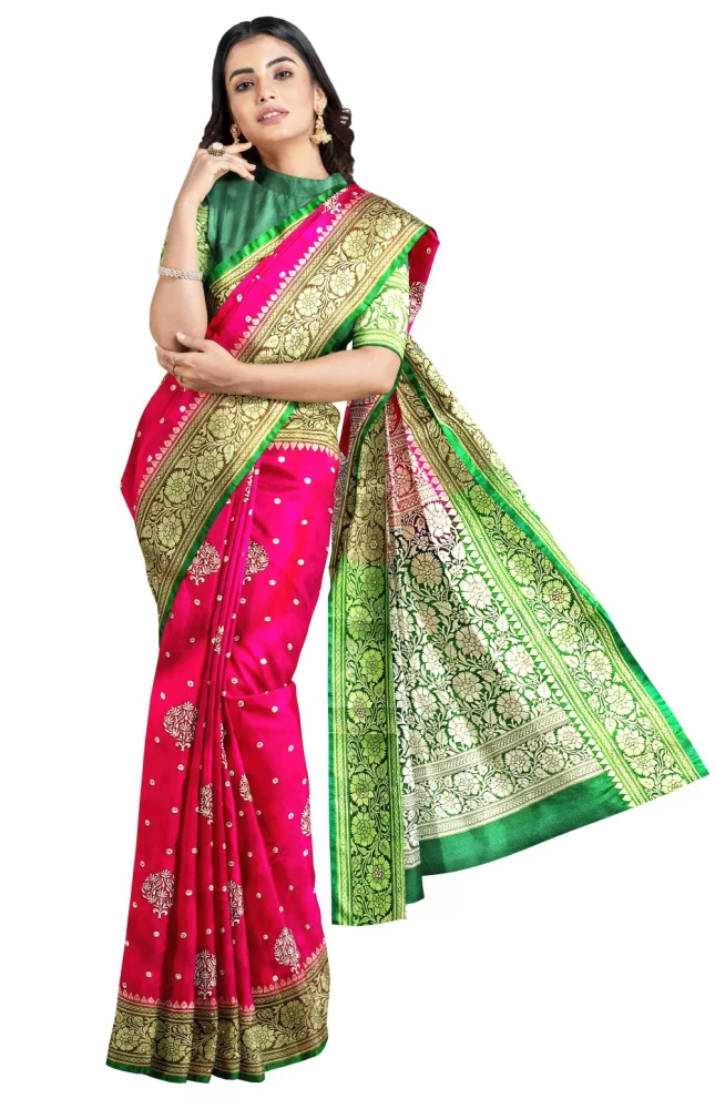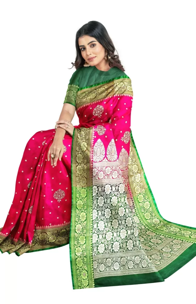 Exclusive Rani Banarsi Silk Embroidery Saree With Green Blouse