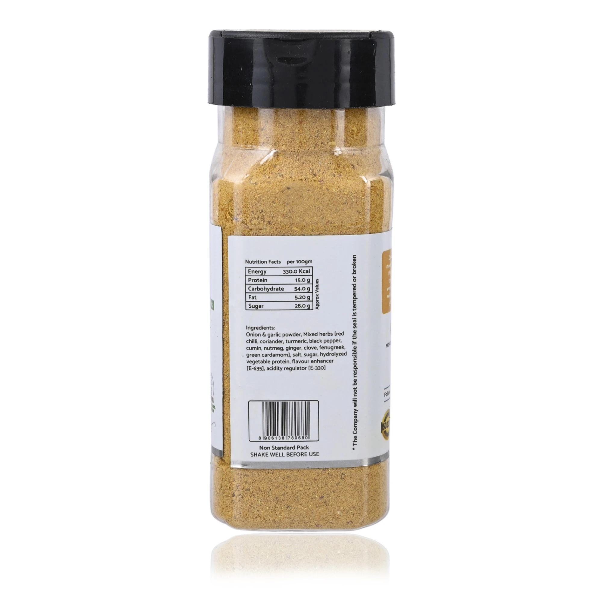 Onion & garlic powder, Mixed herbs [red chilli, coriander, turmeric, black pepper. cumin, nutmeg, ginger, clove, fenugreek, green cardamom), salt, sugar, hydrolyzed vegetable protein, flavour enhancer [E-635], acidity regulator [E-330]