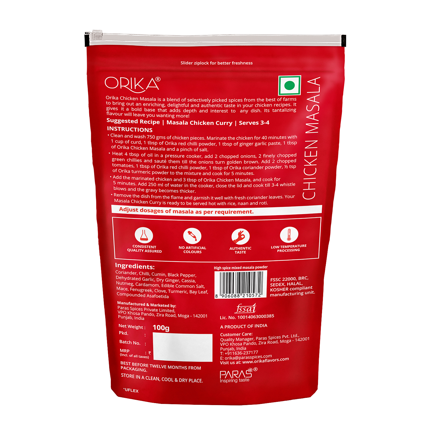 Orika’s Chicken Masala guarantees restaurant like Chicken at home. Create a solid, bold base; introduce depth & intense notes of flavour in your Chicken preparations with our exclusive Chicken Masala. Spicy, tangy, extremely rich & succulent, Chicken infused with this Masala uplifts the taste profile without interfering with Chicken’s inherent flavour.