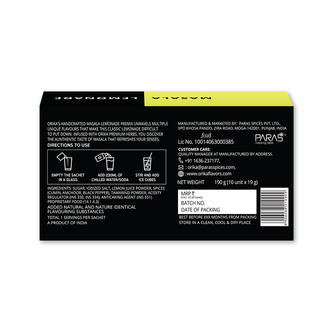 Orika’s Handcrafted masala lemonade premix unravels multiple unique flavours that make this classic lemonade difficult to put down. Infused with Orika premium herbs, you discover the authentic taste of masala that refreshes your senses. Mono carton with 10 sachets each of 19gm.