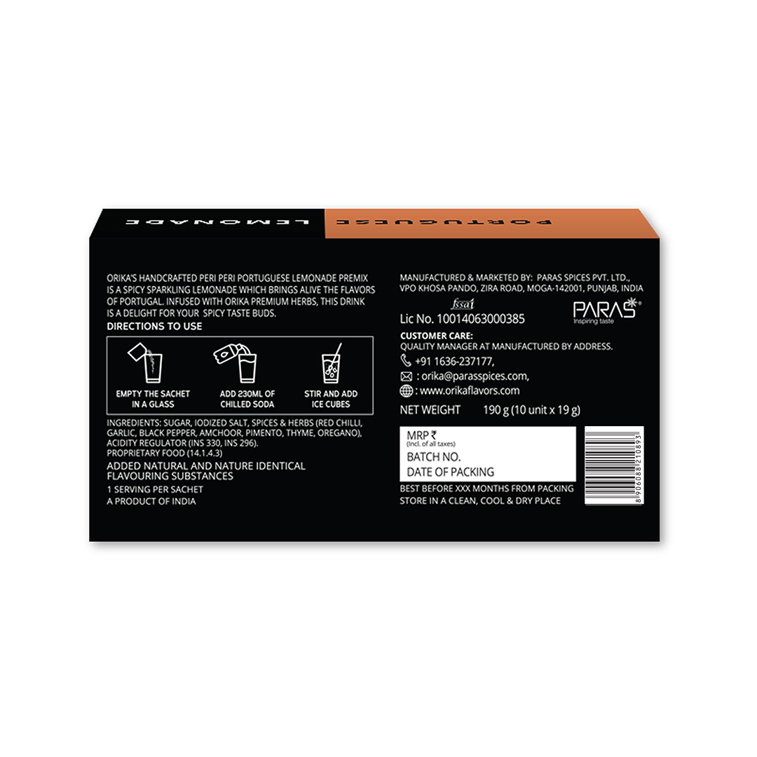 Orika’s Handcrafted Peri Peri based Portuguese Lemonade Premix is a spicy sparkling lemonade which brings alive the flavours of Portugal. Infused with Orika premium herbs, this drink is a spice kick for your taste buds. Mono carton with 10 sachets each of 19g.