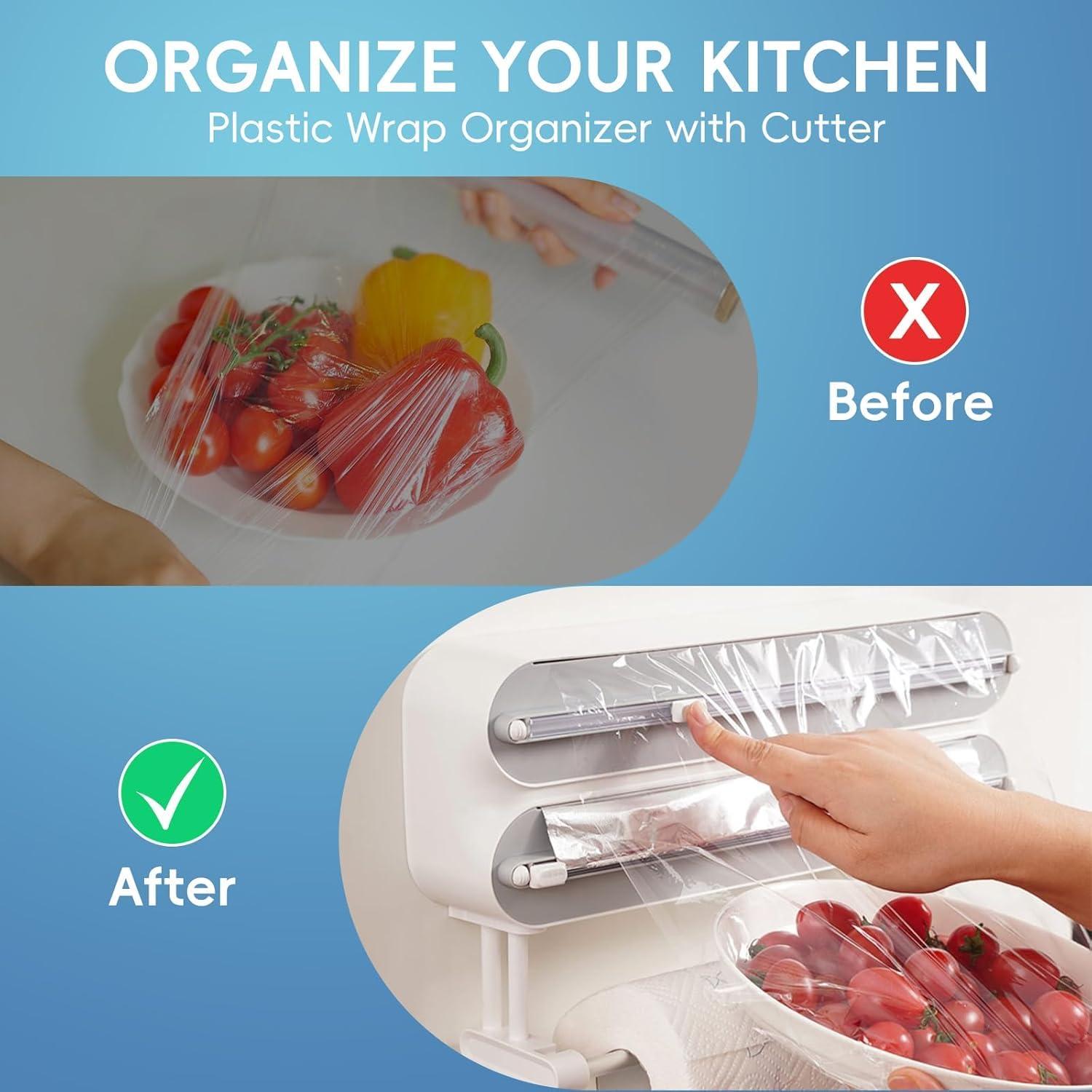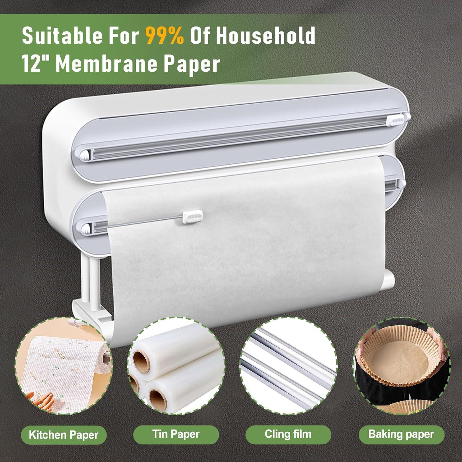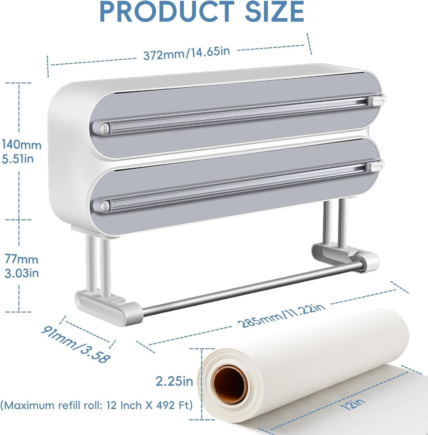 About this item 3 IN 1 DESIGN : The foil and plastic wrap organizer can hold one roll of plastic wrap, one roll of aluminum foil or parchment paper, and another roll of Kitchen Tissue Roll Holder. which is very convenient to access and saves a ton of space on your kitchen countertop! SLIDE CUTTER: The kitchen wrap organizer with 2 slots has a built-in two-way hidden sliding blade - sharp and durable, each slot has a cutter, making a straight cut & long-lasting. Safe operation without injury to your hands. Compatible with Aluminum foil/Cling Wrap/Tin foil /Parchment paper/Baking sheets. MAGNETIC DESIGN: The cling film dispenser bottom with a magnetic strip is robust and makes it adsorbed on metal surfaces such as fridges readily. It comes with 2 hooks on the back, so you can hang it anywhere on the wall or countertop, making packing food quick and easy - a very handy space saver in your Kitchen Items for Home. QUALITY MATERIALS: The wrap dispenser with cutter is made of premium ABS material. Premium materials make high-quality products, the refills' outer diameter should be ≤ 2.24 in / 5.7cm and the width ≤ 12 in / 30.5cm. if rolls' inner diameter is 1.18 in / 3cm ,Maximum plastic wrap refill roll size is 12 In X 492 FT. Suitable for kitchen paper towels with width ≤ 11 in and diameter ≤ 5.9 in. 【Hanging Options】-The plastic wrap dispenser with cutter is subjected to that has two ways of use, it can be securely hung on the wall by the wall hook in the package, or it can be attached to a metal surface such as a refrigerator by the magnetic and snap design at the bottom.