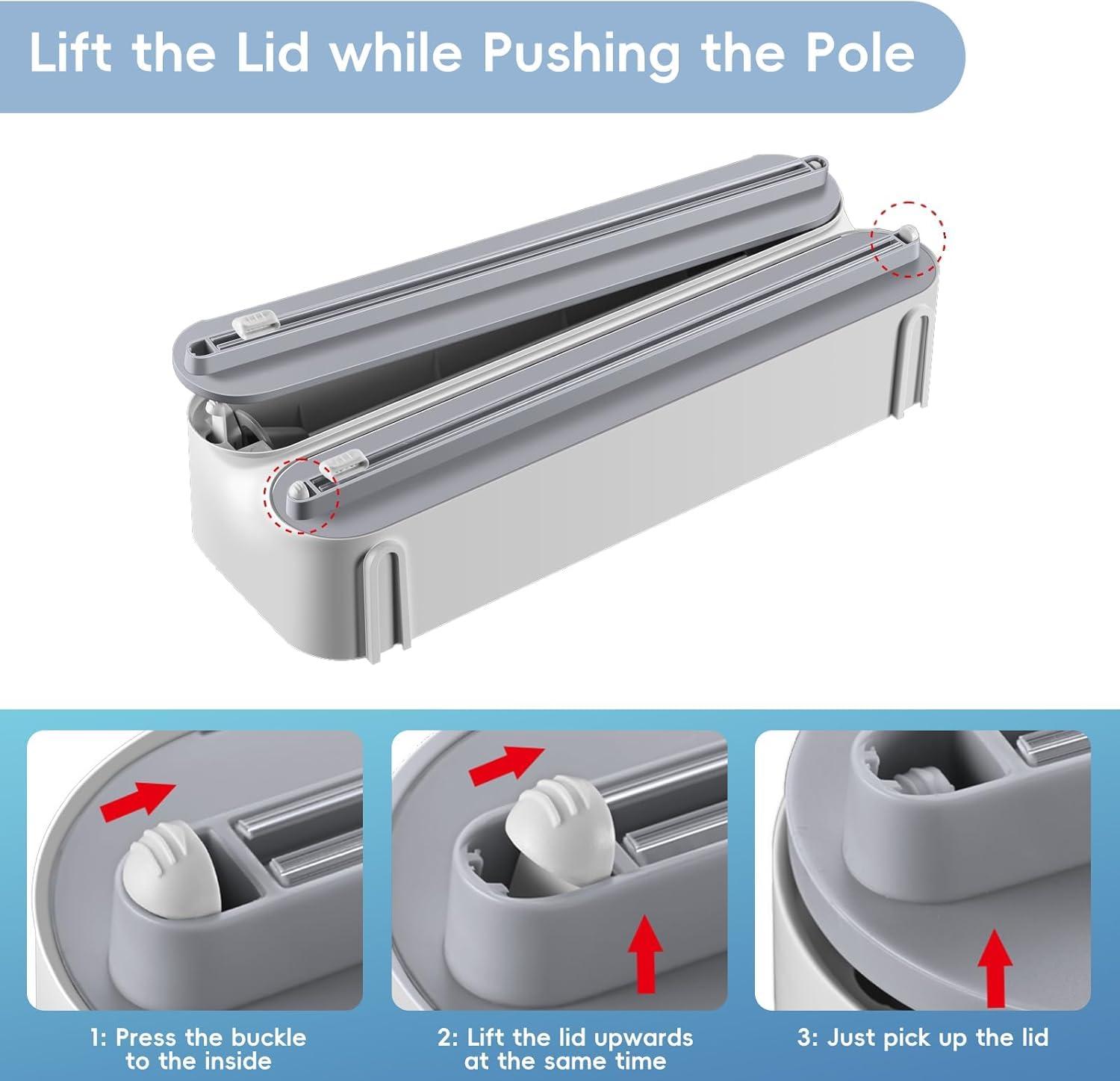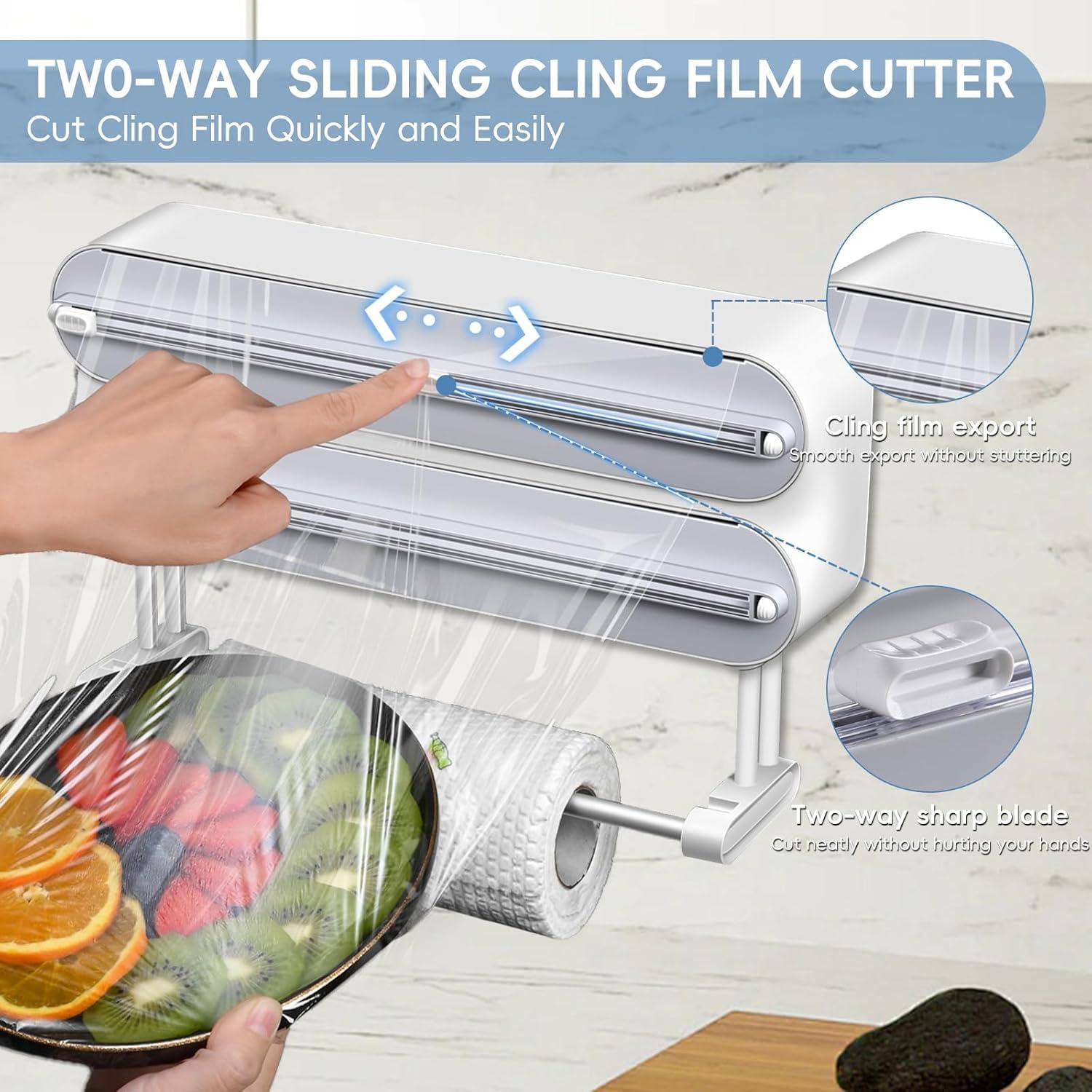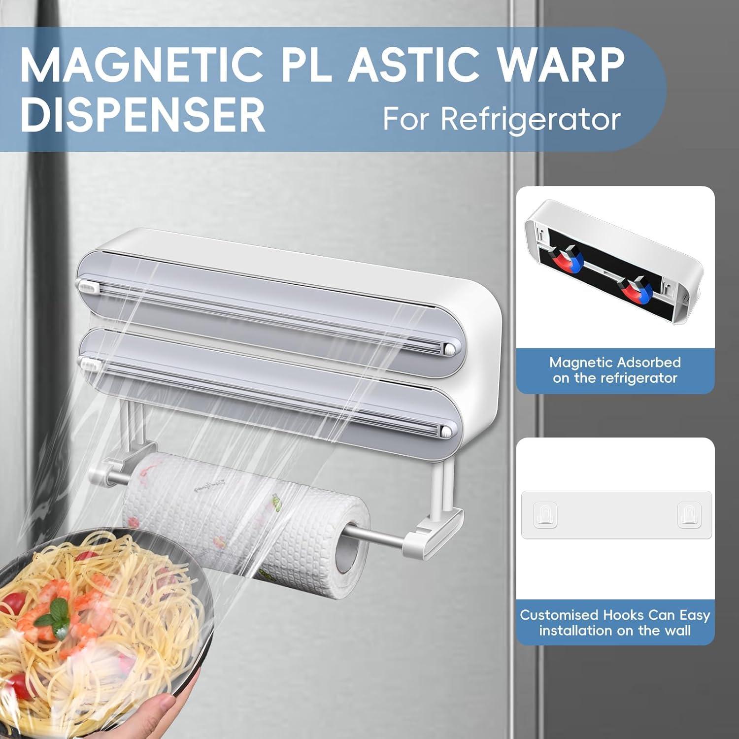 About this item 3 IN 1 DESIGN : The foil and plastic wrap organizer can hold one roll of plastic wrap, one roll of aluminum foil or parchment paper, and another roll of Kitchen Tissue Roll Holder. which is very convenient to access and saves a ton of space on your kitchen countertop! SLIDE CUTTER: The kitchen wrap organizer with 2 slots has a built-in two-way hidden sliding blade - sharp and durable, each slot has a cutter, making a straight cut & long-lasting. Safe operation without injury to your hands. Compatible with Aluminum foil/Cling Wrap/Tin foil /Parchment paper/Baking sheets. MAGNETIC DESIGN: The cling film dispenser bottom with a magnetic strip is robust and makes it adsorbed on metal surfaces such as fridges readily. It comes with 2 hooks on the back, so you can hang it anywhere on the wall or countertop, making packing food quick and easy - a very handy space saver in your Kitchen Items for Home. QUALITY MATERIALS: The wrap dispenser with cutter is made of premium ABS material. Premium materials make high-quality products, the refills' outer diameter should be ≤ 2.24 in / 5.7cm and the width ≤ 12 in / 30.5cm. if rolls' inner diameter is 1.18 in / 3cm ,Maximum plastic wrap refill roll size is 12 In X 492 FT. Suitable for kitchen paper towels with width ≤ 11 in and diameter ≤ 5.9 in. 【Hanging Options】-The plastic wrap dispenser with cutter is subjected to that has two ways of use, it can be securely hung on the wall by the wall hook in the package, or it can be attached to a metal surface such as a refrigerator by the magnetic and snap design at the bottom.