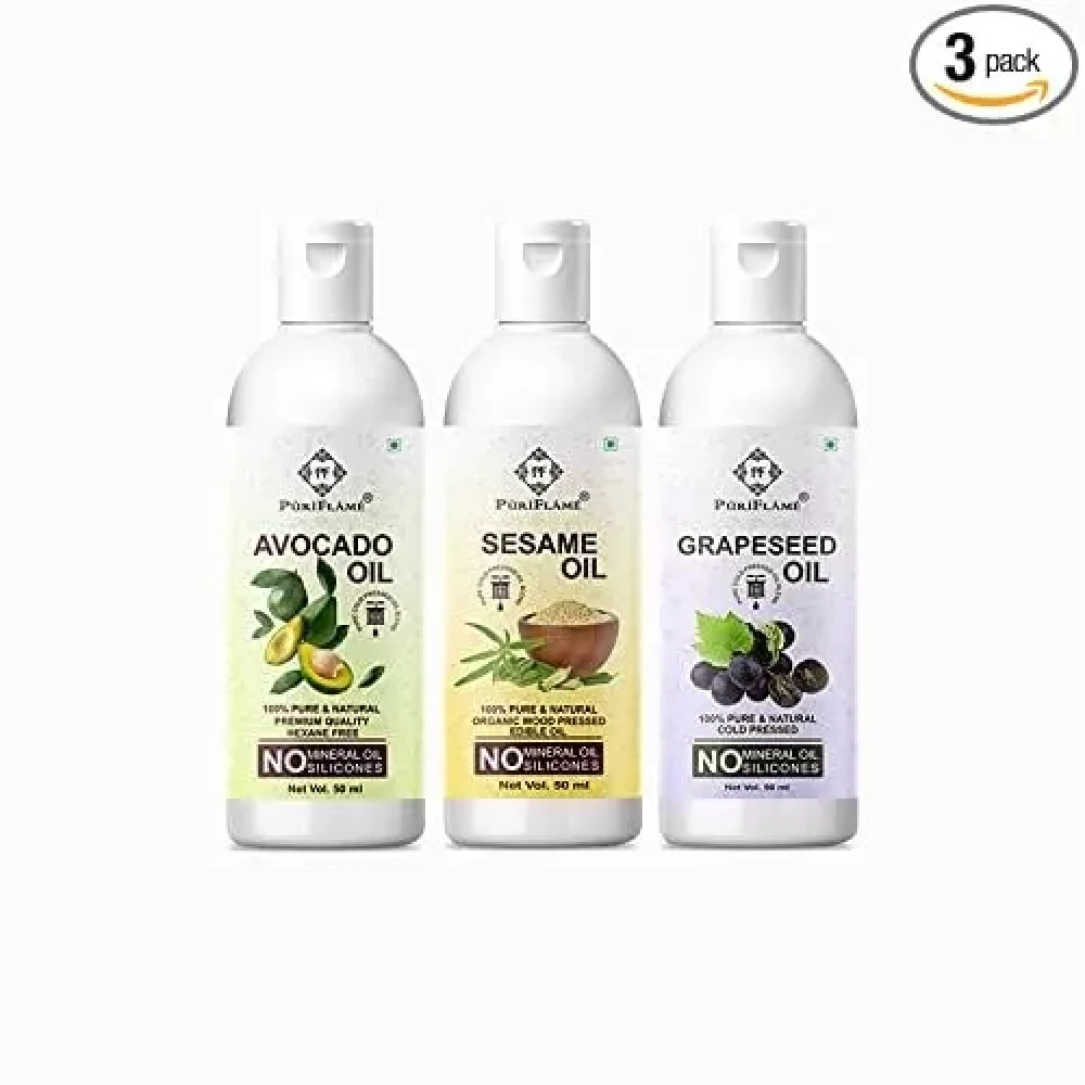 PuriFlame 100% Pure Avocado Oil 50ML and Sesame Oil 50ML and Grapeseed Oil 50ML For Rapid Hair Growth