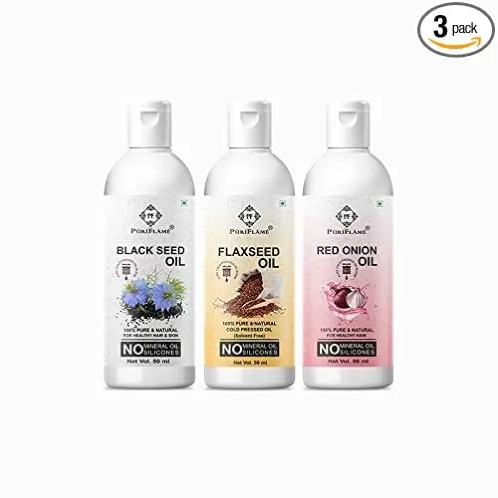 PuriFlame 100% Pure Blackseed Oil 50ML and Flaxseed Oil 50ML and Red Onion Oil 50ML Combo For Rapid Hair Growth