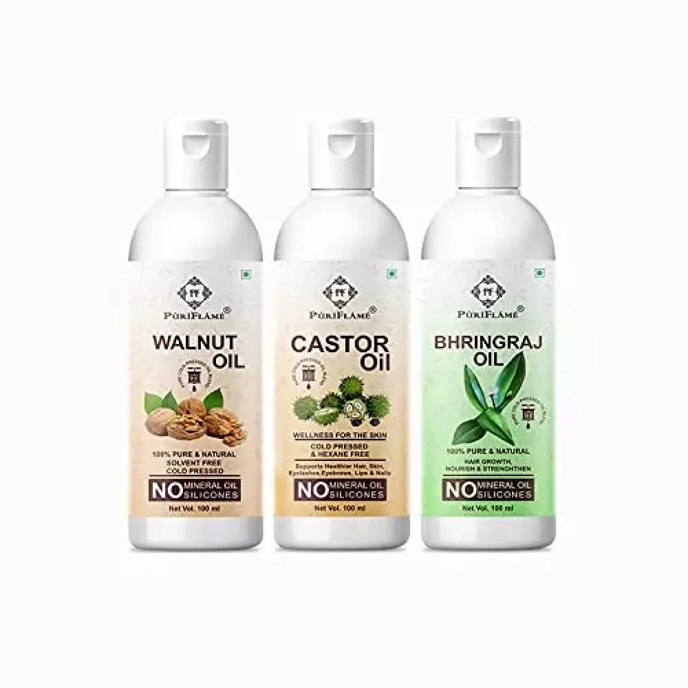 PuriFlame 100% Pure Walnut Oil 100ML and Castor Oil 100ML and Bhringraj Oil 100ML Combo For Hair