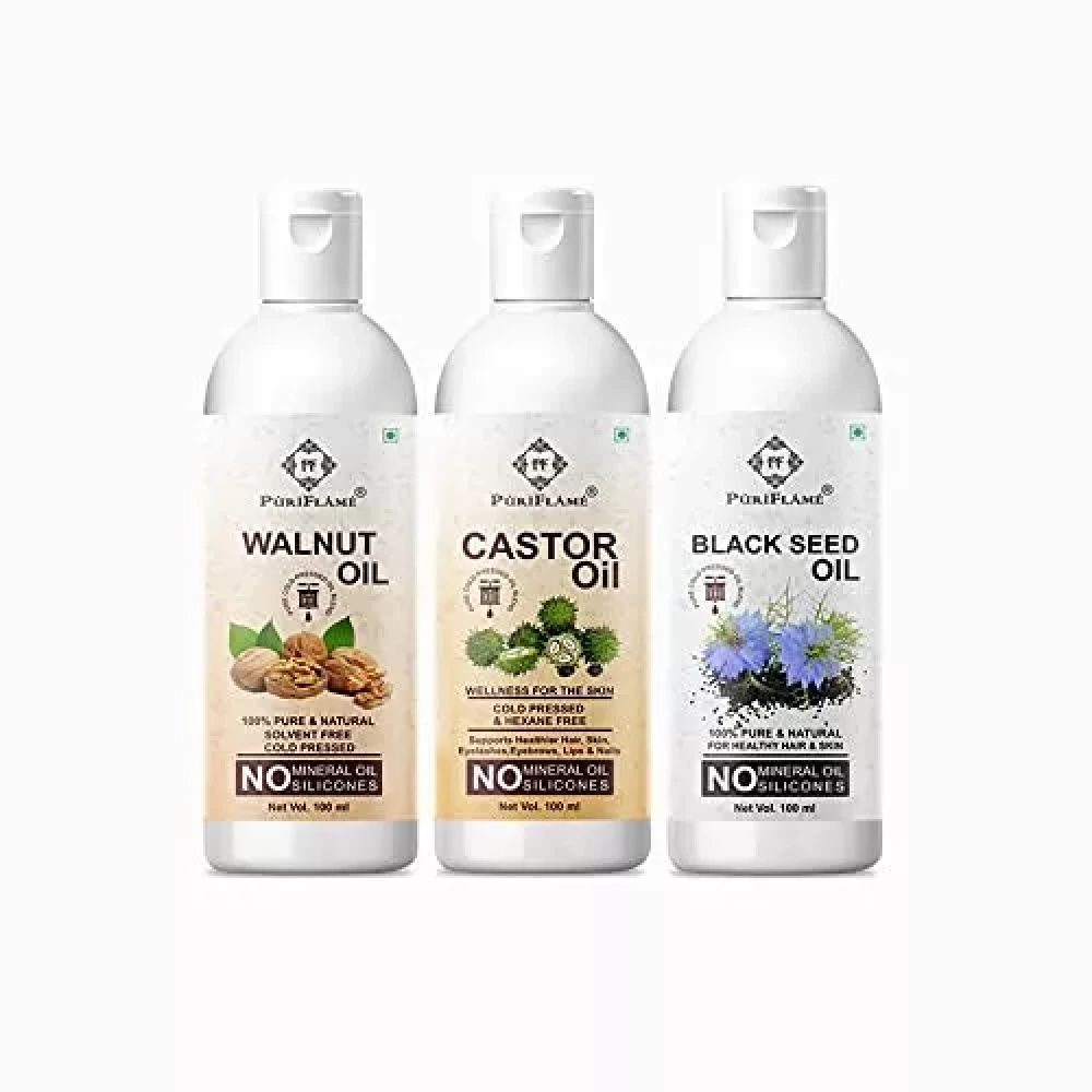 PuriFlame 100% Pure Walnut Oil 100ML and Castor Oil 100ML and Blackseed Oil 100ML Combo For Hair