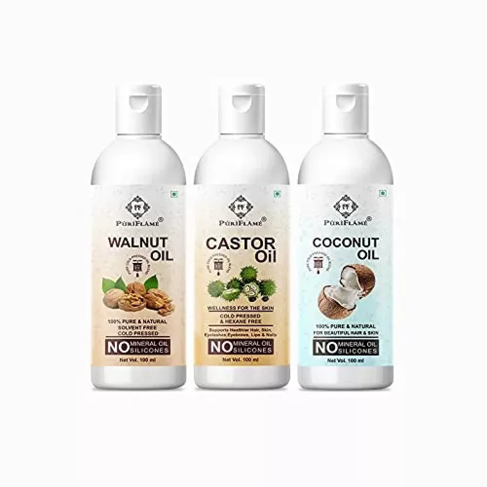 PuriFlame 100% Pure Walnut Oil 100ML and Castor Oil 100ML and Coconut Oil 100ML Combo For Hair