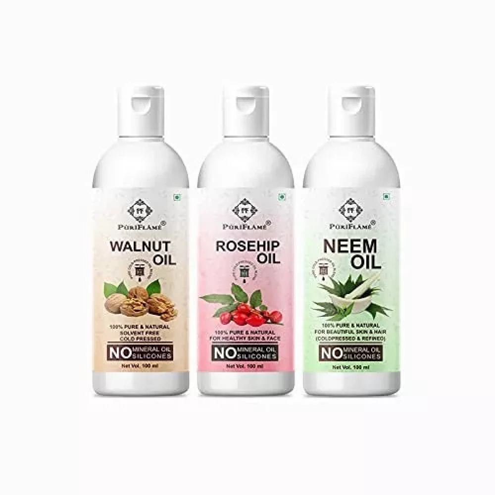 PuriFlame 100% Pure Walnut Oil 100ML and Rosehip Oil 100ML and Neem Oil 100 ML Combo For Hair