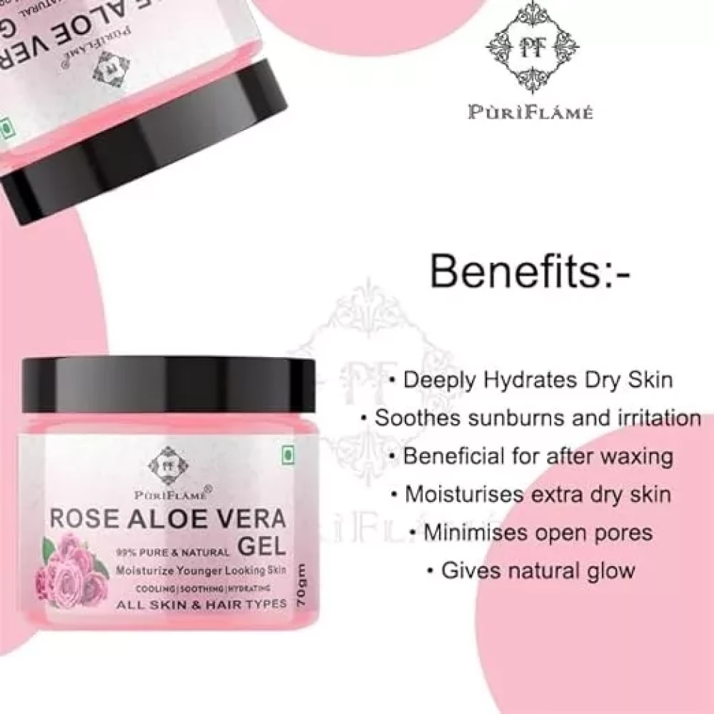 PuriFlame 99% Pure Rose Aloe Vera Gel for Face Skin and Hair 70GM Pack Of 3