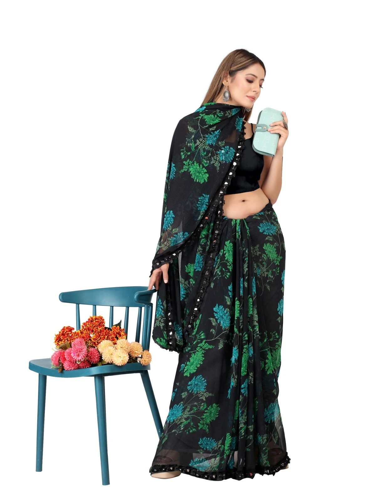 The saree features a contemporary floral printed design that exudes femininity and grace. The intricate floral motifs add a playful yet elegant touch to the saree, creating a harmonious balance between tradition and modernity. The absence of mirrors provides a minimalist charm, catering to those with a penchant for subtle sophistication.
