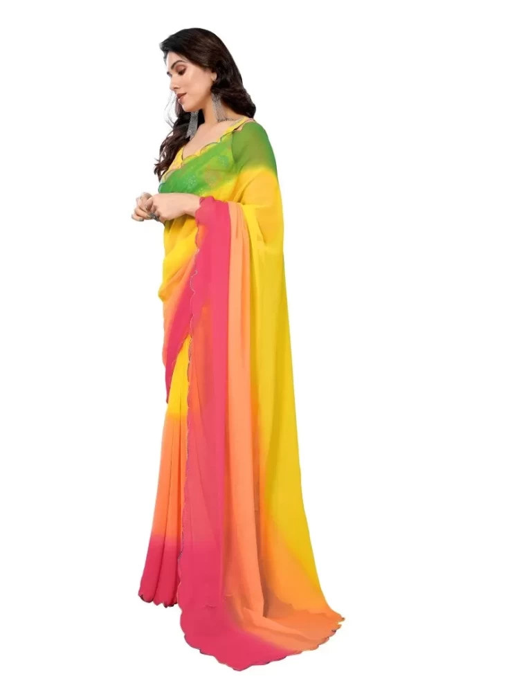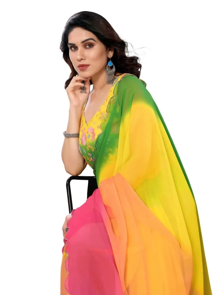 Georgette PLAIN Green Pink SAREE WITH EMBROIDERY WORK BLOUSE