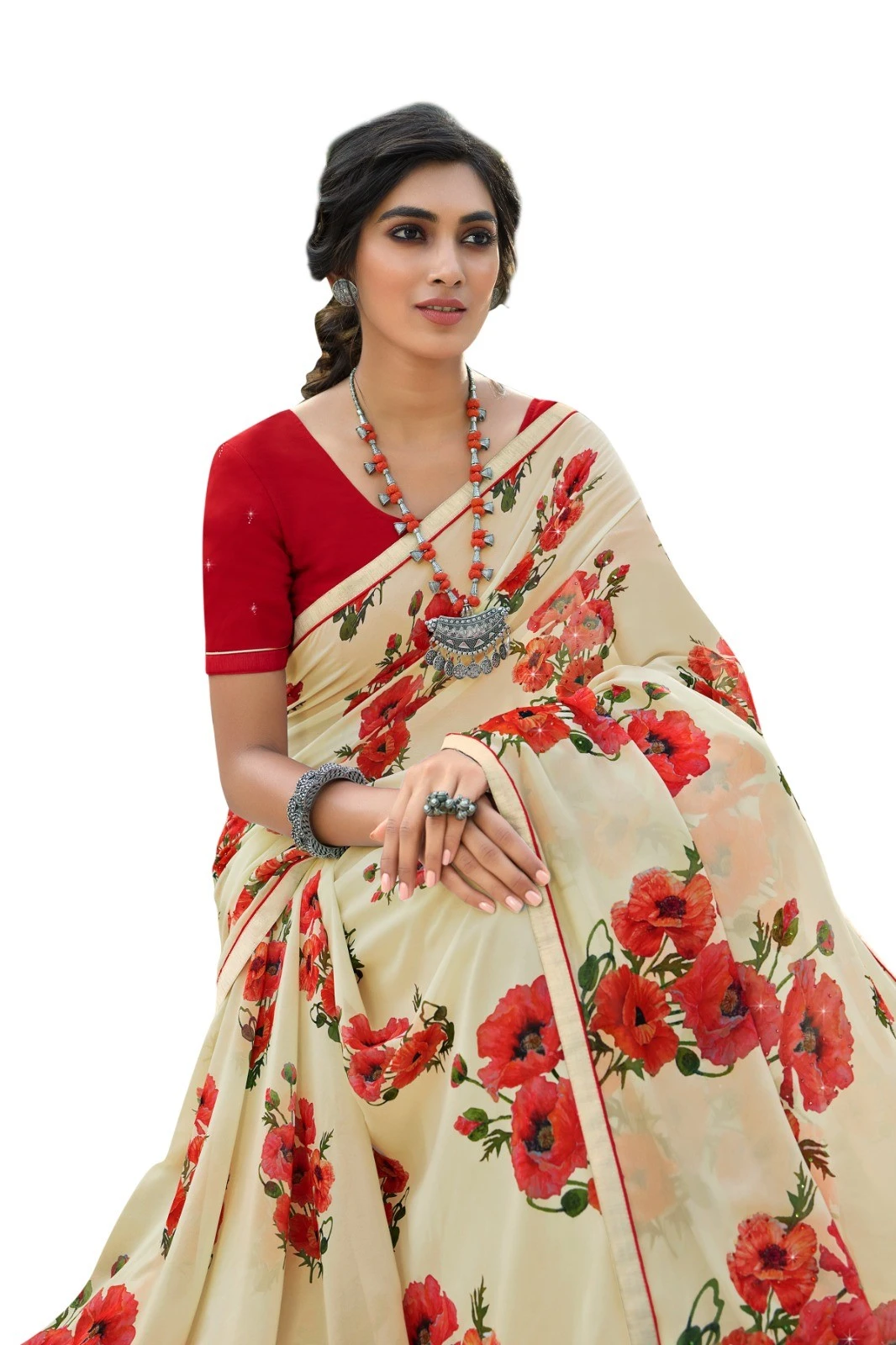 Pattern: This saree features a stylish floral print design that adds a touch of femininity and sophistication to your look. The intricate floral patterns are meticulously printed on the Cream Georgette fabric, creating a vibrant and eye-catching ensemble. Whether you're attending a casual gathering or a special occasion, this saree is sure to make you stand out.