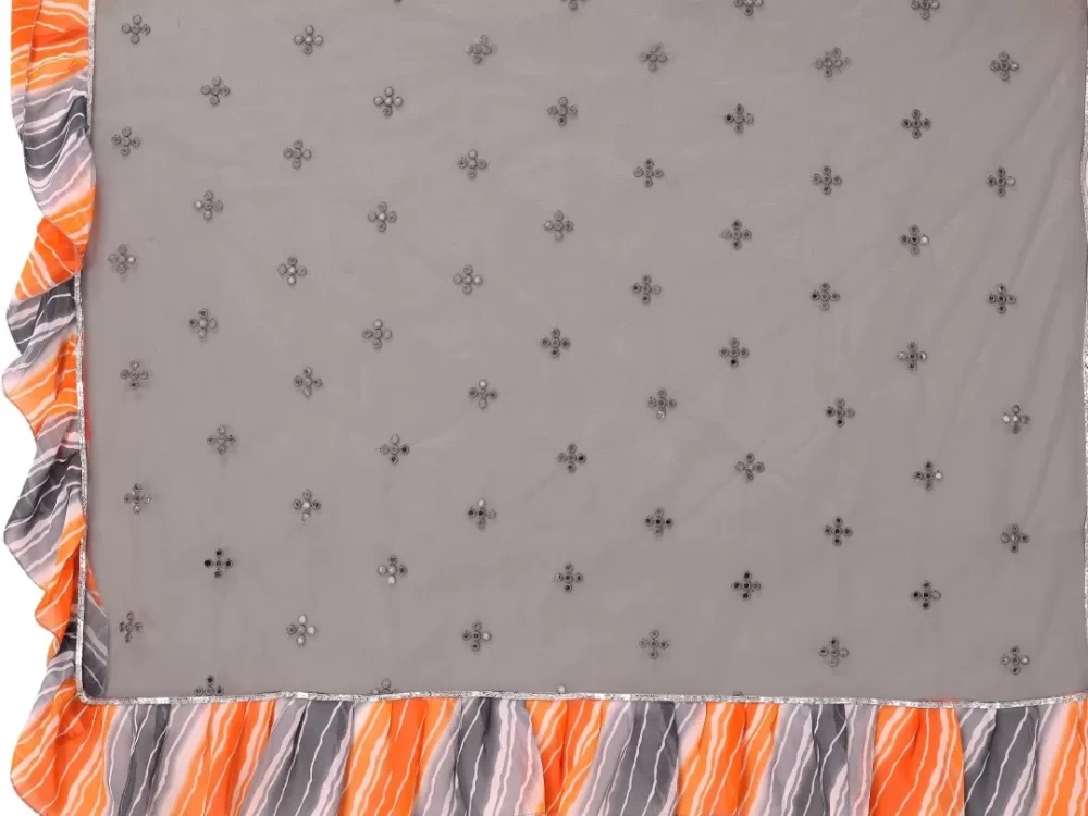 The saree is crafted from high-quality fabric in a sophisticated grey hue, featuring delicate ruffle details along the edges. The ruffles add a touch of contemporary flair to the traditional saree, creating a beautiful and flowing silhouette that enhances your grace and poise.